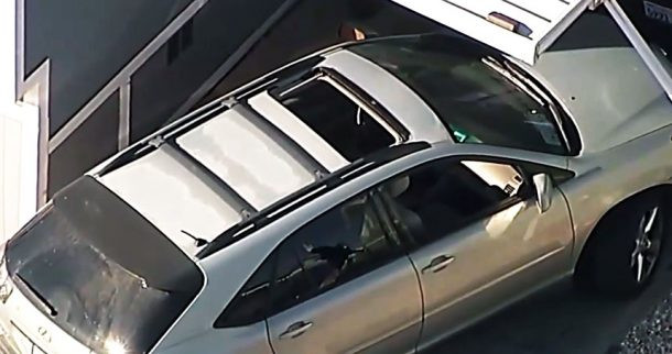 ICE執法人員向SUV開槍,可見後座車窗部分破裂。ABC7電視畫面