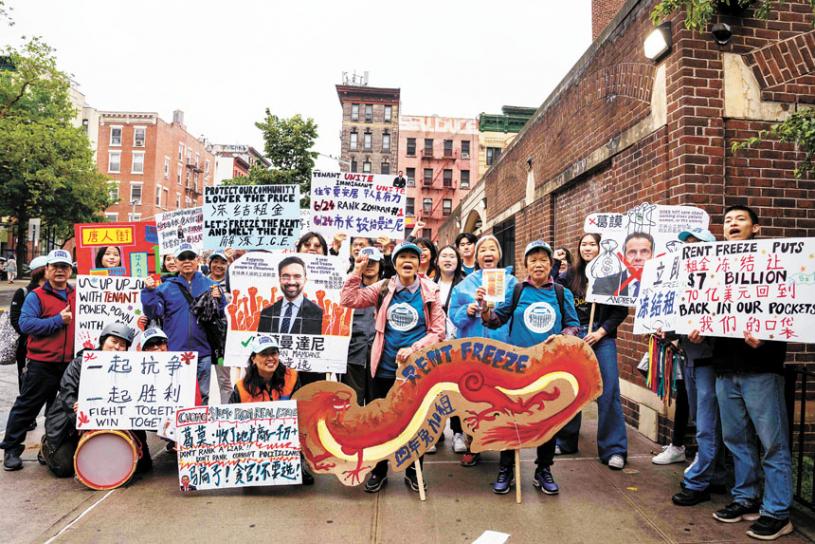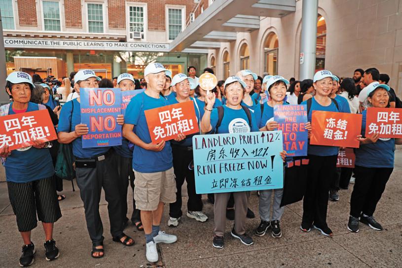 紐約華埠租客聯盟成員在6月紐約市長初選中為馬姆達尼造勢拉票。徐芳華提供