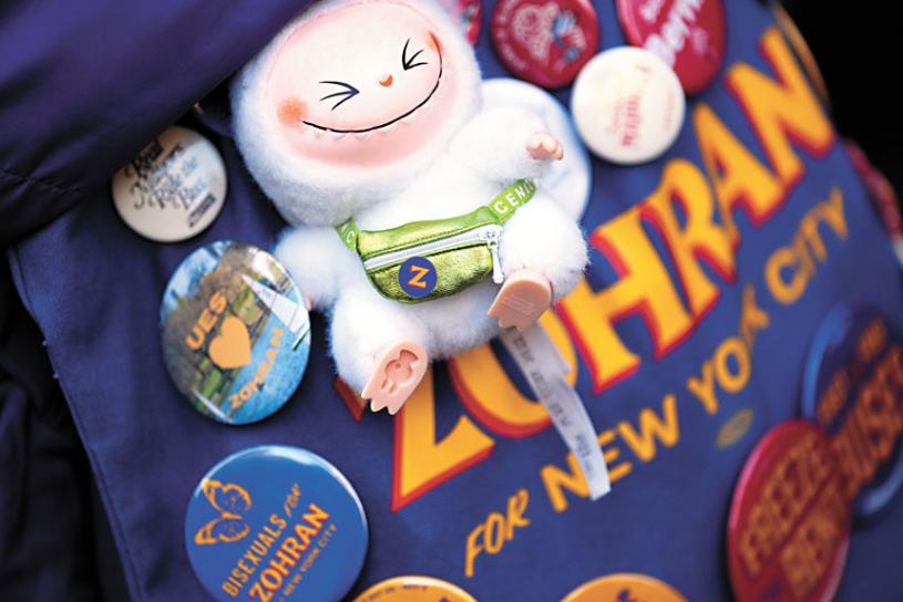 馬姆達尼的一名支持者背包上貼著各類宣傳鈕扣和一個拉布布玩偶。美聯社