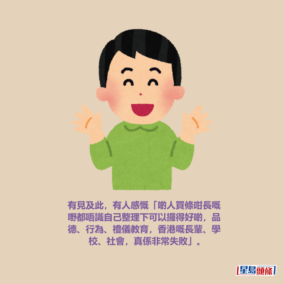 有見及此,有人感慨「啲人買條咁長嘅嘢都唔識自己整理下可以攞得好啲,品德、行為、禮儀教育,香港嘅長輩、學校、社會,真係非常失敗」。
