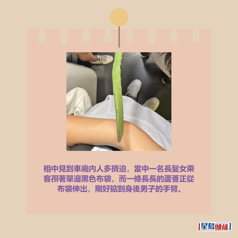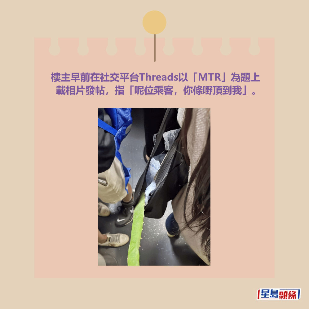 樓主早前在社交平台Threads以「MTR」為題上載相片發帖,指「呢位乘客,你條嘢頂到我」。相中見到車廂內人多擠迫,當中一名長髮女乘客孭著單邊黑色布袋,而一條長長的蘆薈正從布袋伸出,剛好掂到身後男子的手臂。