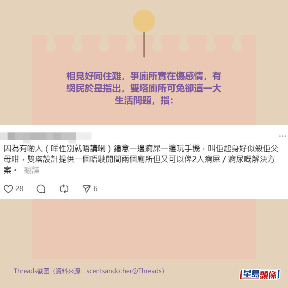 相見好同住難,爭廁所實在傷感情,有網民於是指出,雙塔廁所可免卻這一大生活問題,指「因為有啲人(咩性別就唔講喇)鍾意一邊屙屎一邊玩手機,叫佢起身好似殺佢父母咁,雙塔設計提供一個唔使間開兩個廁所但又可以俾2人屙屎/屙尿嘅解決方案」。