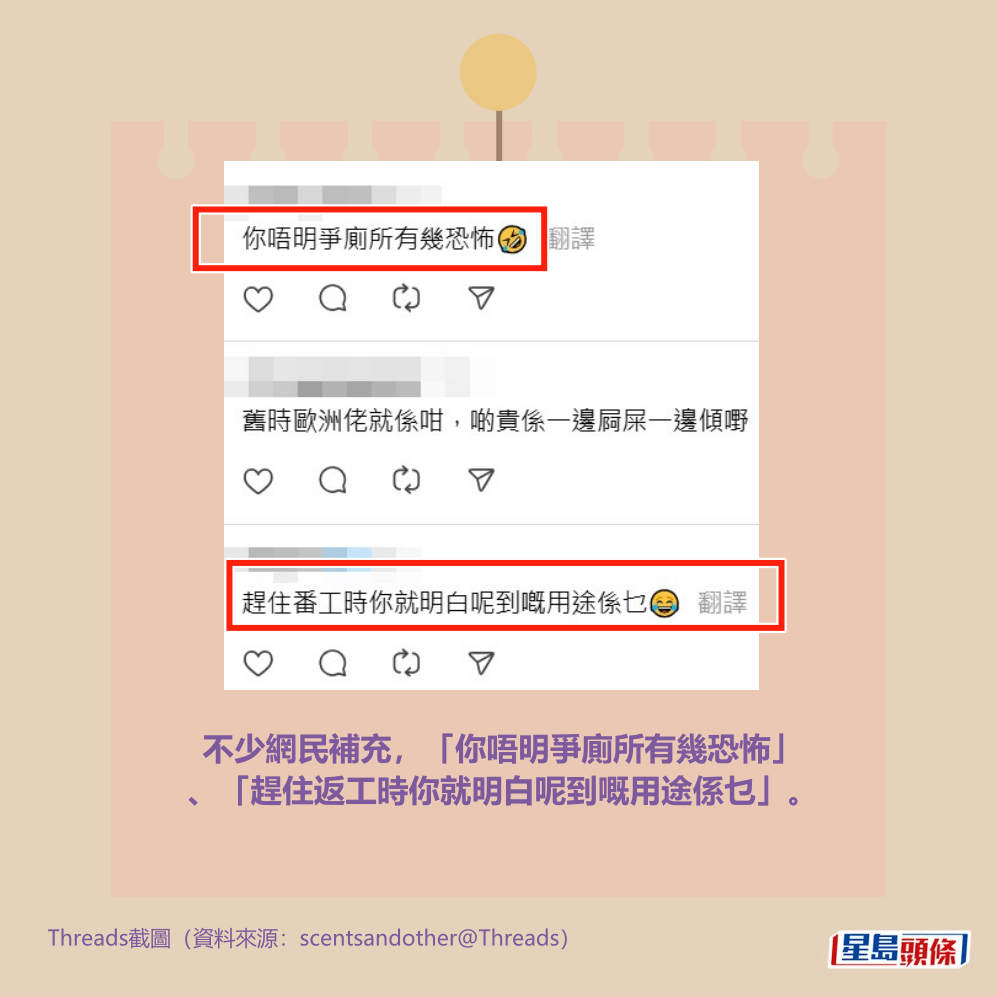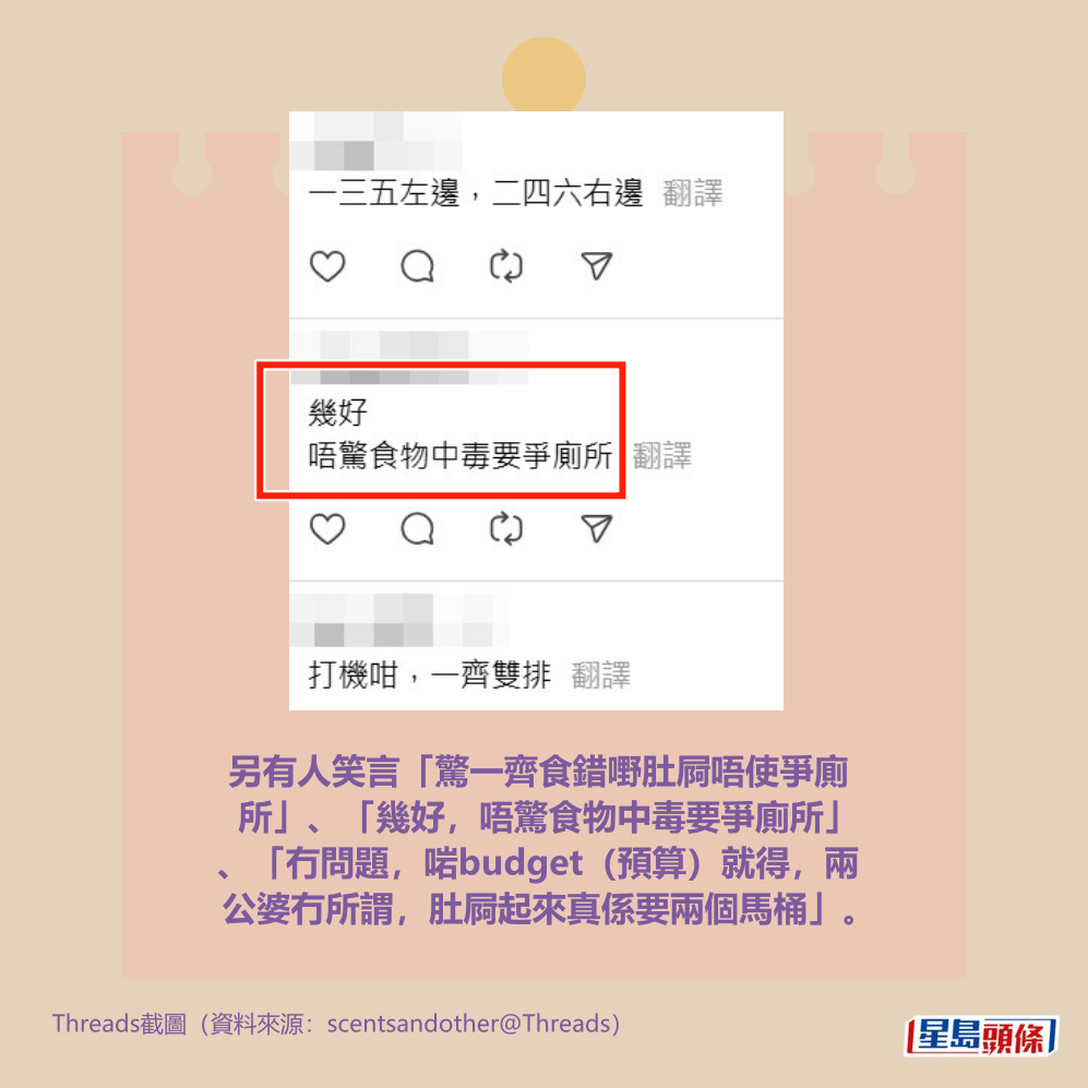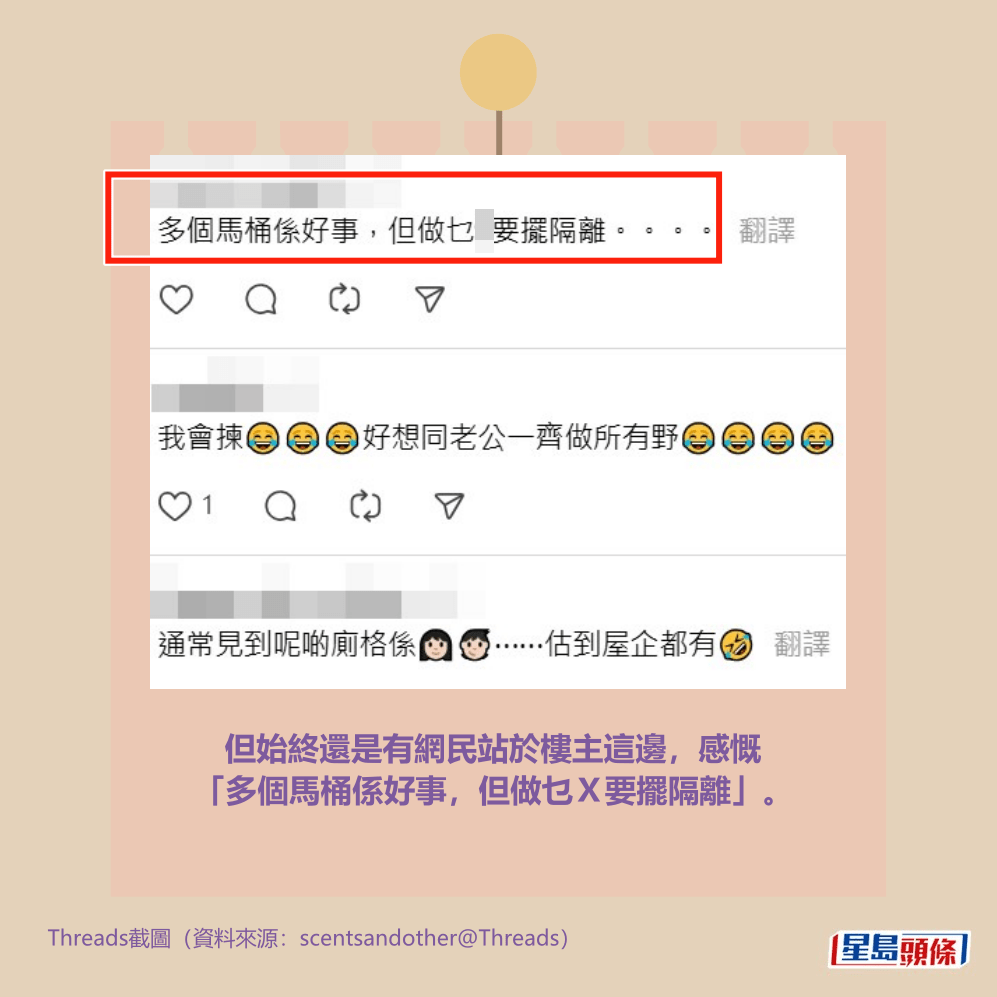 但始終還是有網民站於樓主這邊,感慨「多個馬桶係好事,但做乜X要擺隔離」。