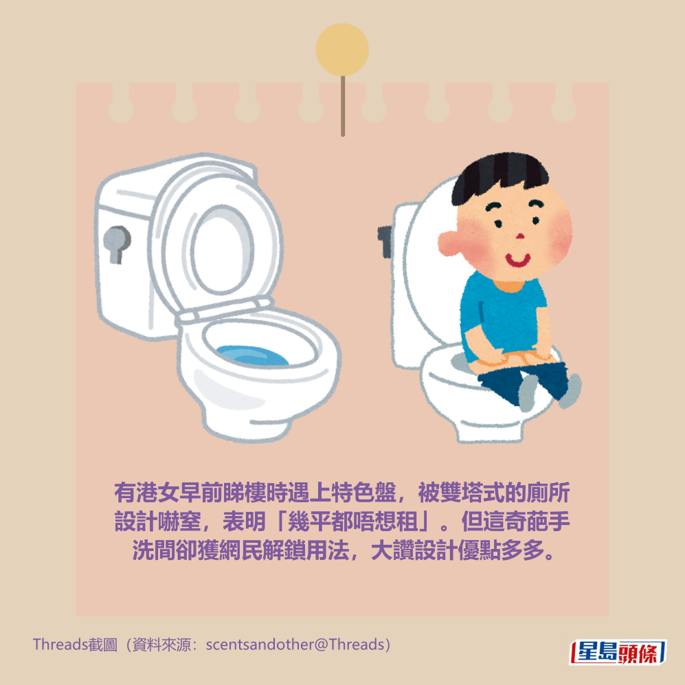 有港女早前睇樓時遇上特色盤,被雙塔式的廁所設計嚇窒,表明「幾平都唔想租」。但這奇葩手洗間卻獲網民解鎖用法,大讚設計優點多多。