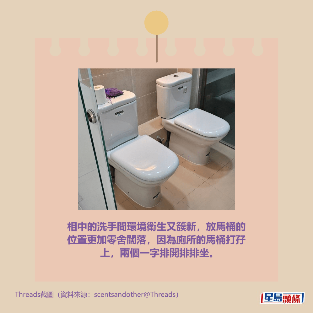 相中的洗手間環境衛生又簇新,放馬桶的位置更加零舍闊落,因為廁所的馬桶打孖上,兩個一字排開排排坐。