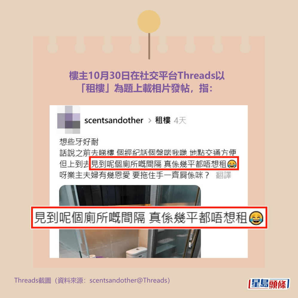 樓主10月30日在社交平台Threads以「租樓」為題上載相片發帖,指「想些牙(share,分享)好耐,話說之前去睇樓,個經紀話個盤啱我哋,地點交通方便,但上到去見到呢個廁所嘅間隔,真係幾平都唔想租😂呀業主夫婦有幾恩愛,要拖住手一齊屙係咪?」。