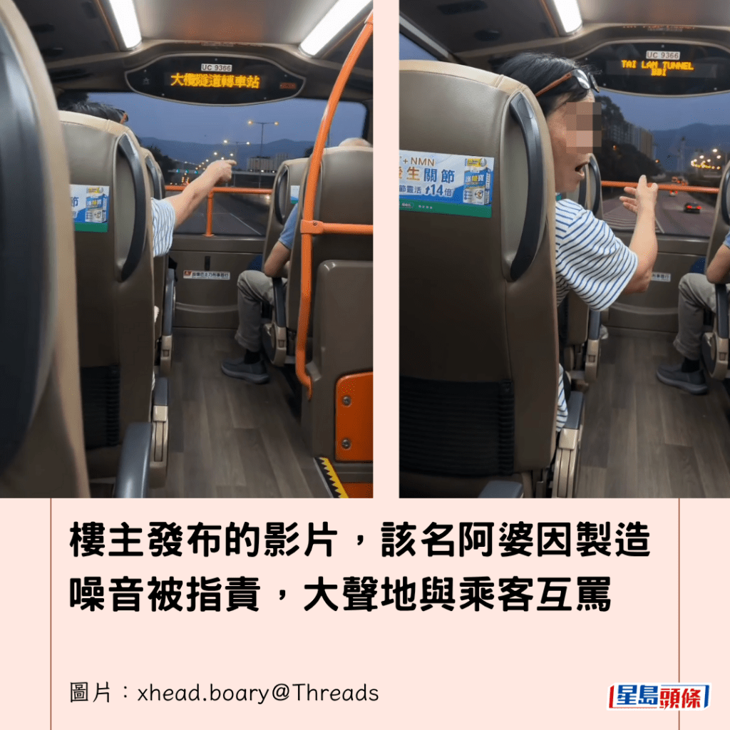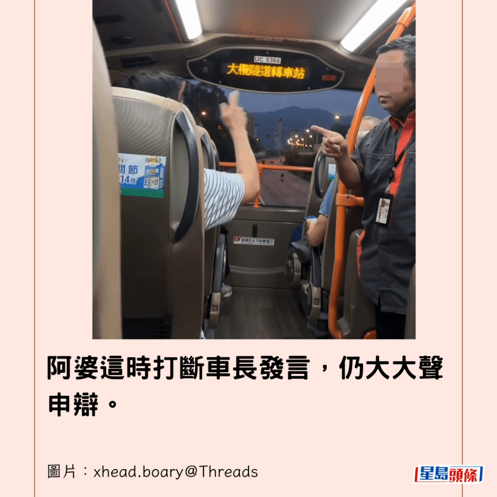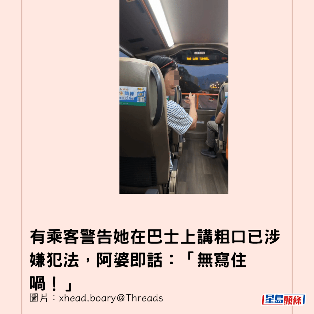 有乘客警告她在巴士上講粗口已涉嫌犯法,阿婆即話:「無寫住喎!」巴士這時停在路旁,車長走上上層,眼見現場爭駁一片嘈雜,他先大喊一聲:「唔好嘈!」