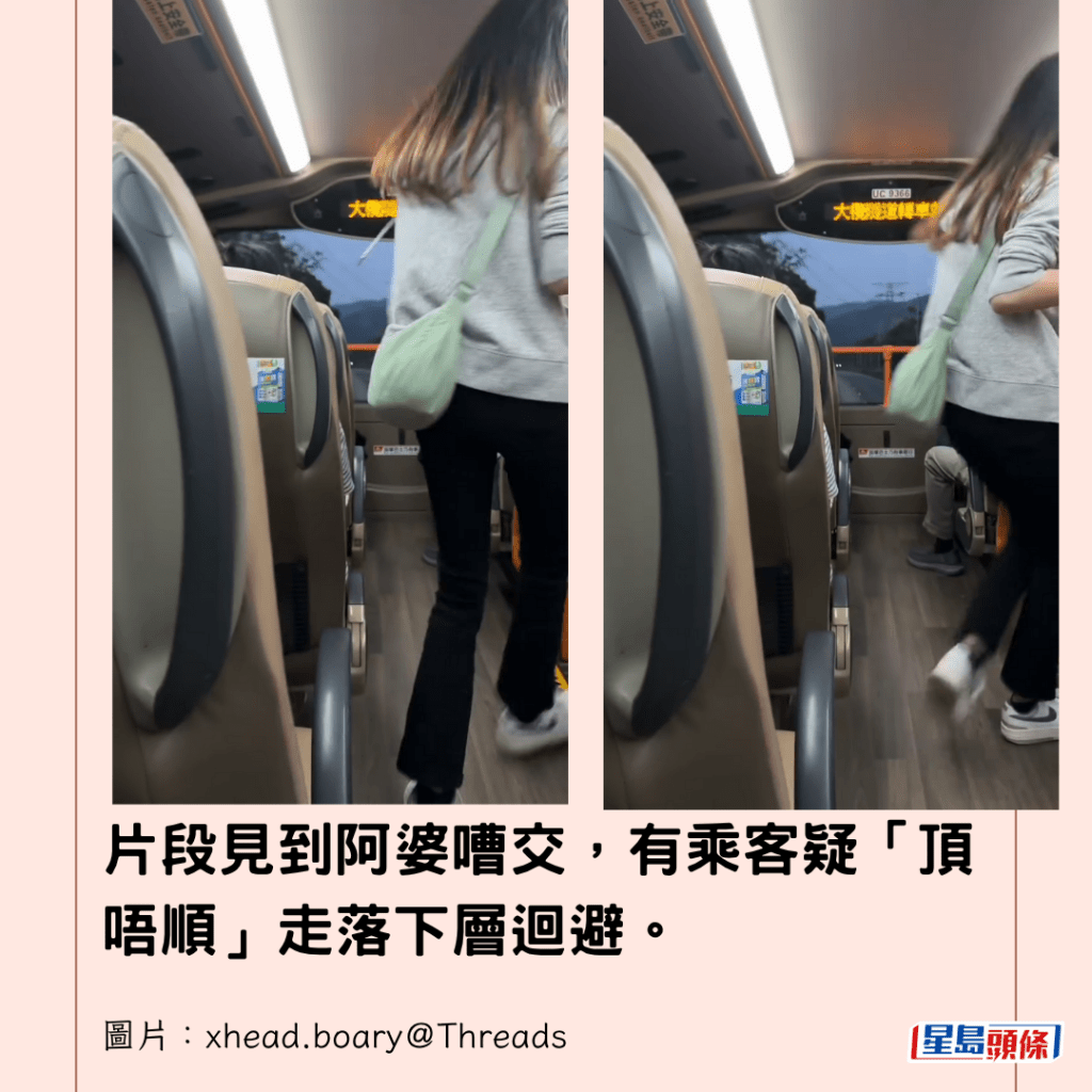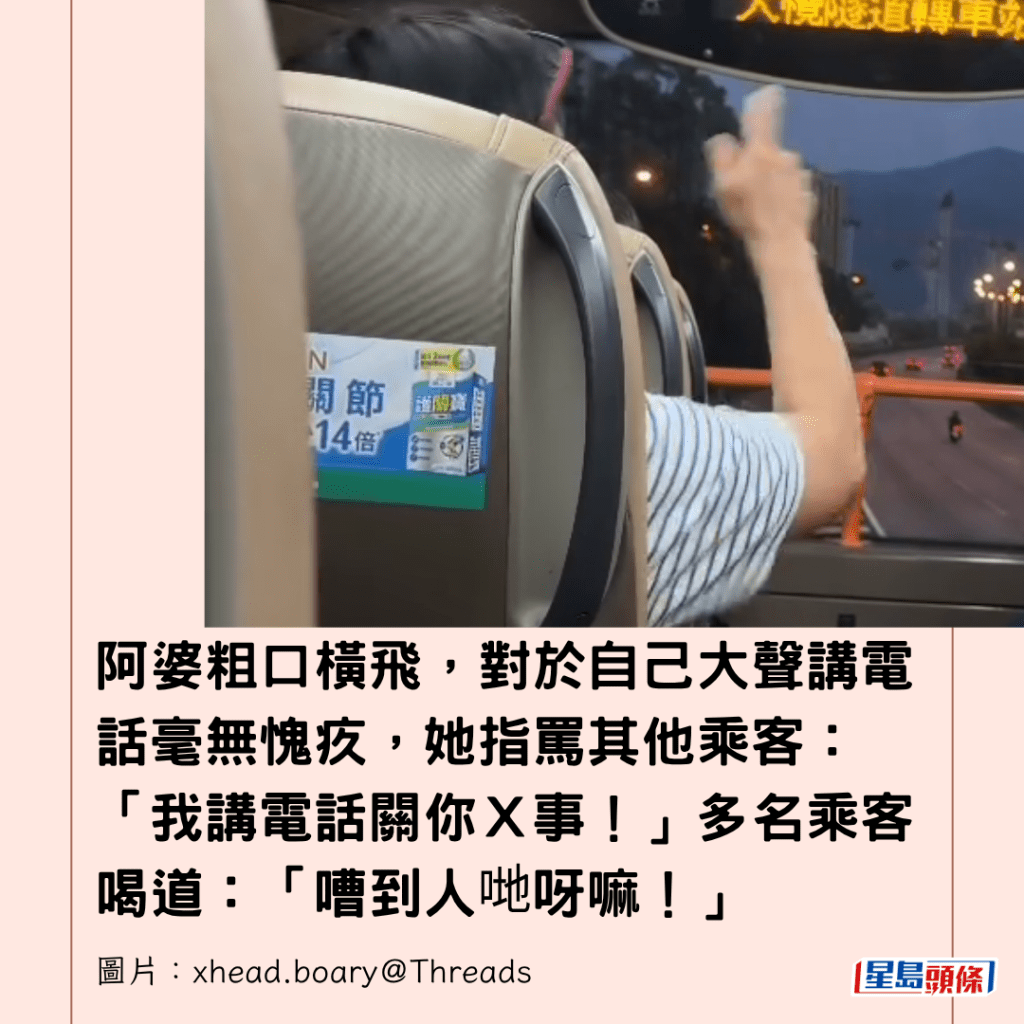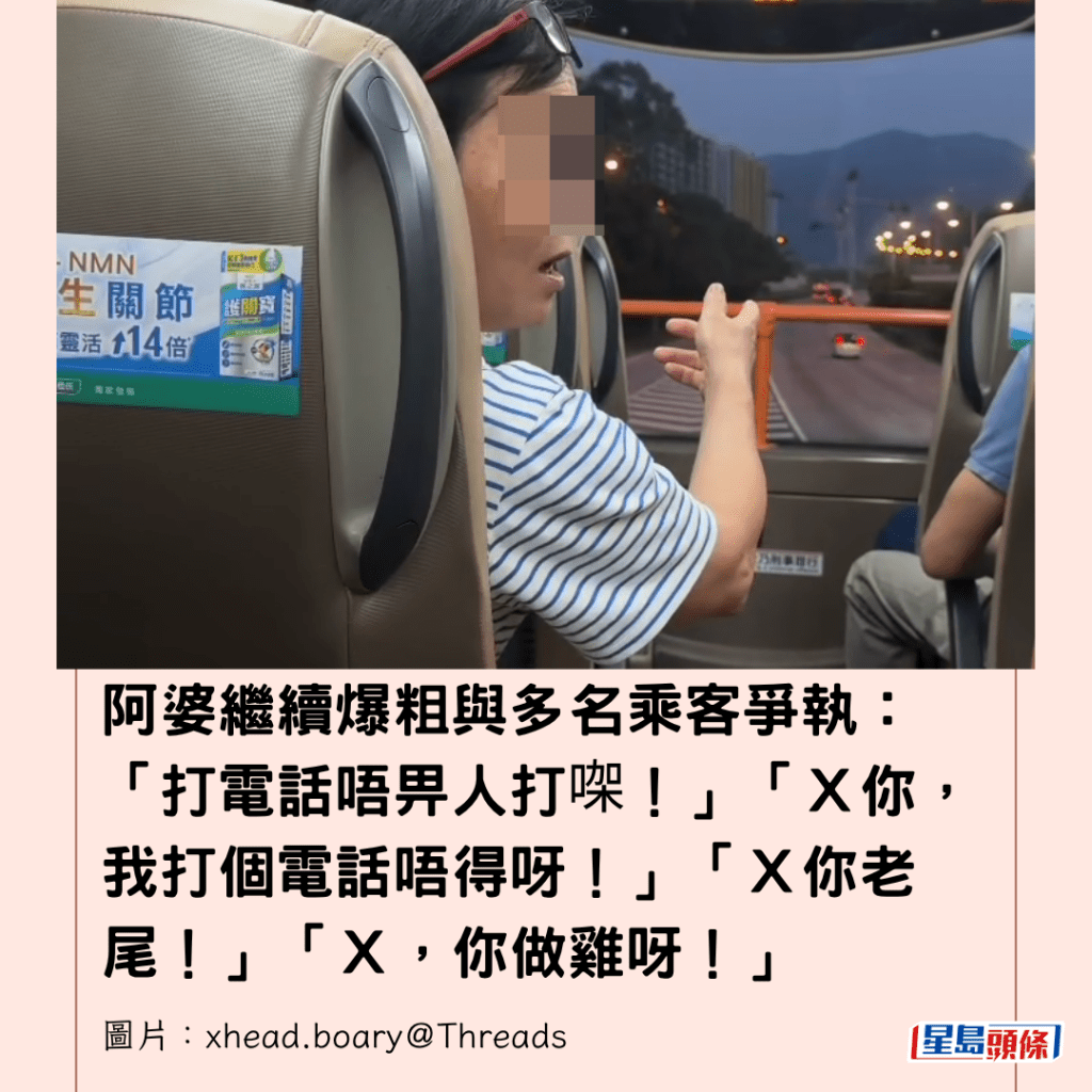片段見到阿婆嘈交,有乘客疑「頂唔順」走落下層迴避。阿婆繼續爆粗與多名乘客爭執:「打電話唔畀人打㗎!」「X你,我打個電話唔得呀!」「X你老尾!」「X,你做雞呀!」