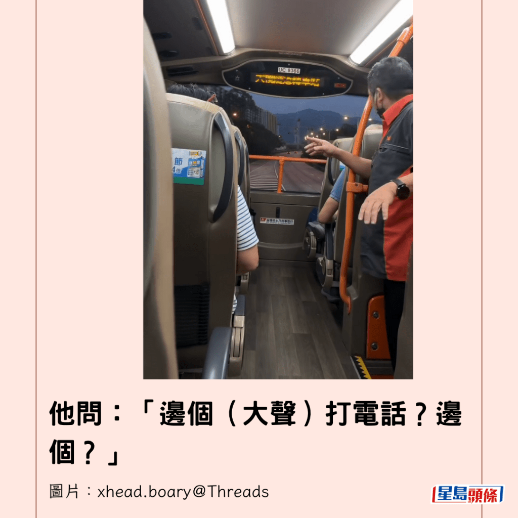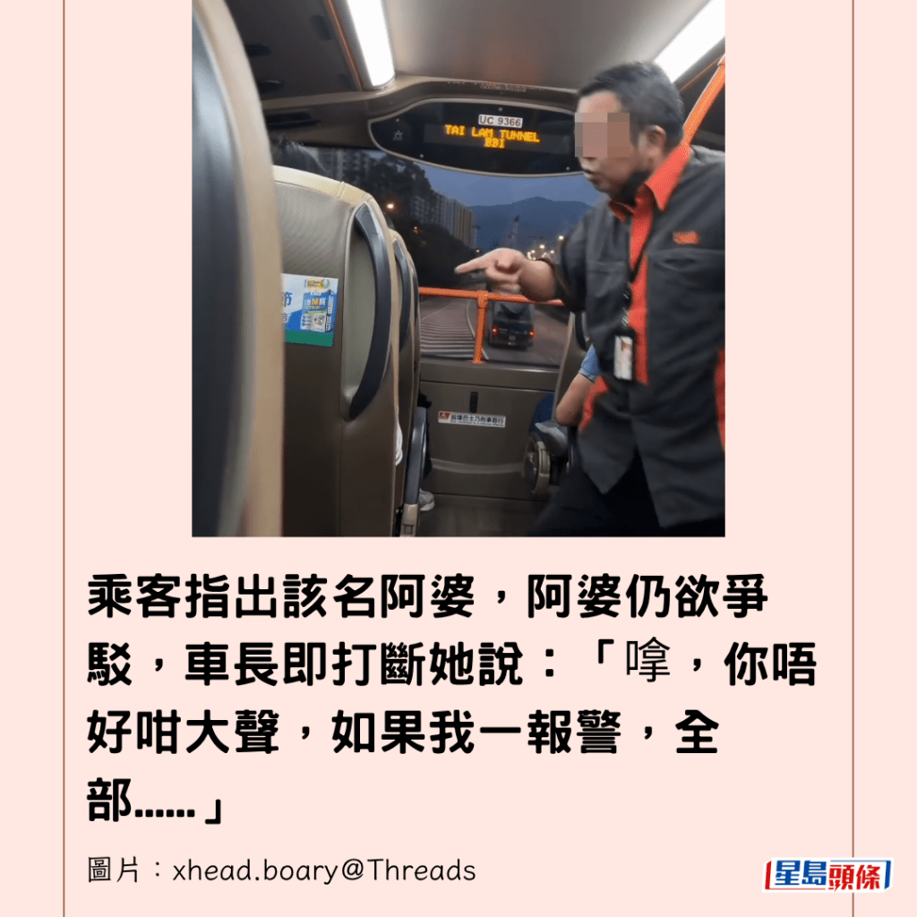 他問:「邊個(大聲)打電話?邊個?」乘客指出該名阿婆,阿婆仍欲爭駁,車長即打斷她說:「嗱,你唔好咁大聲,如果我一報警,全部……」阿婆這時打斷車長發言,仍大大聲申辯。