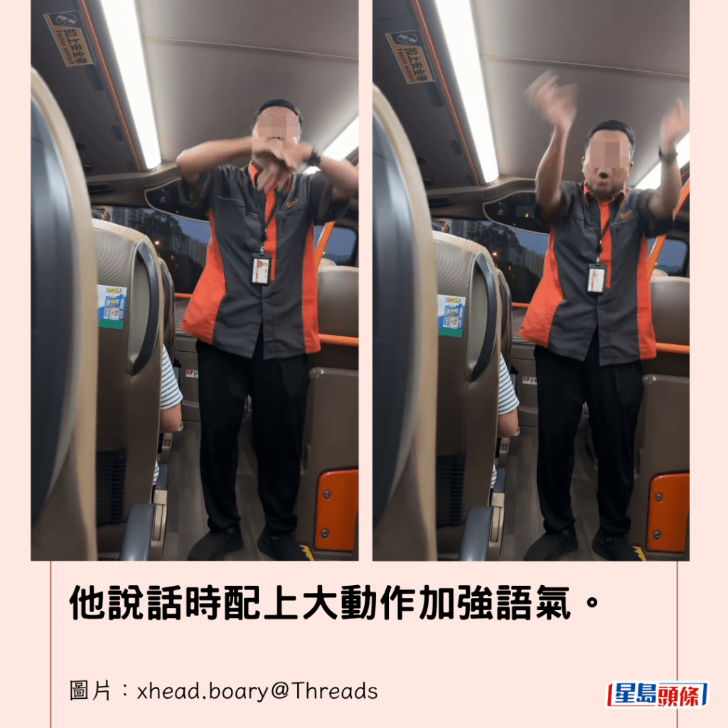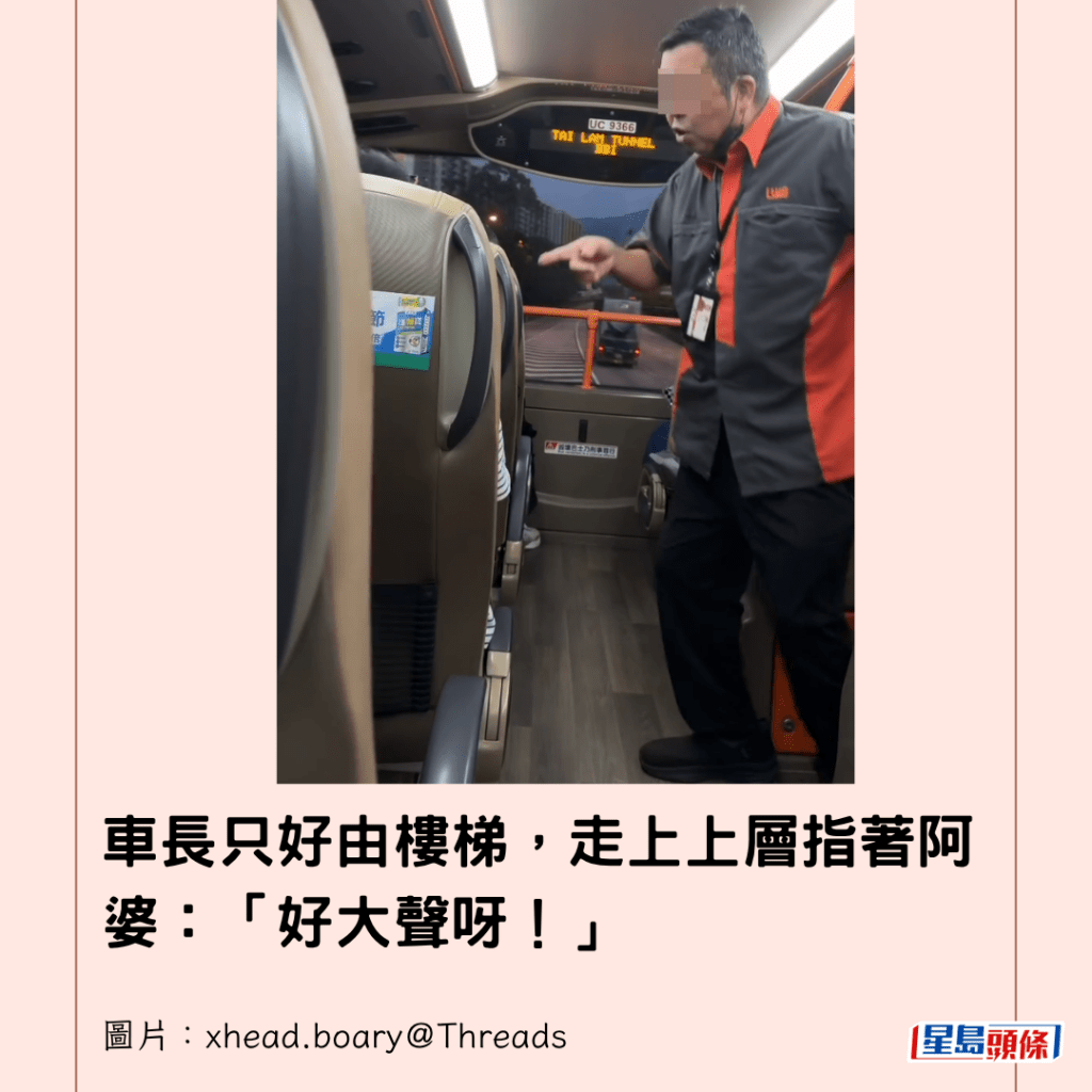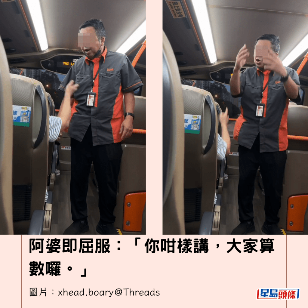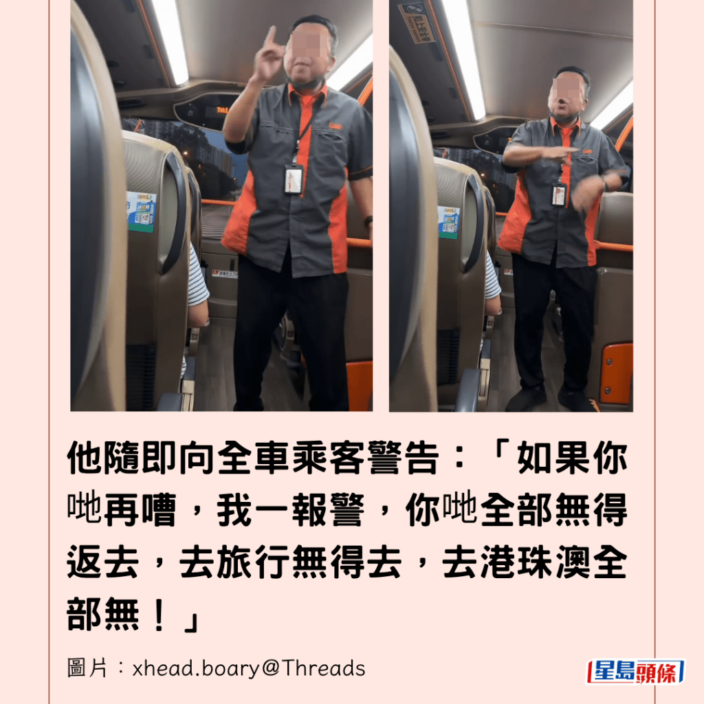 車長只好由樓梯,走上上層指著阿婆:「好大聲呀!」他隨即向全車乘客警告:「如果你哋再嘈,我一報警,你哋全部無得返去,去旅行無得去,去港珠澳全部無!」他說話時配上大動作加強語氣。