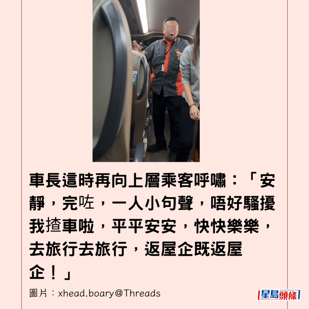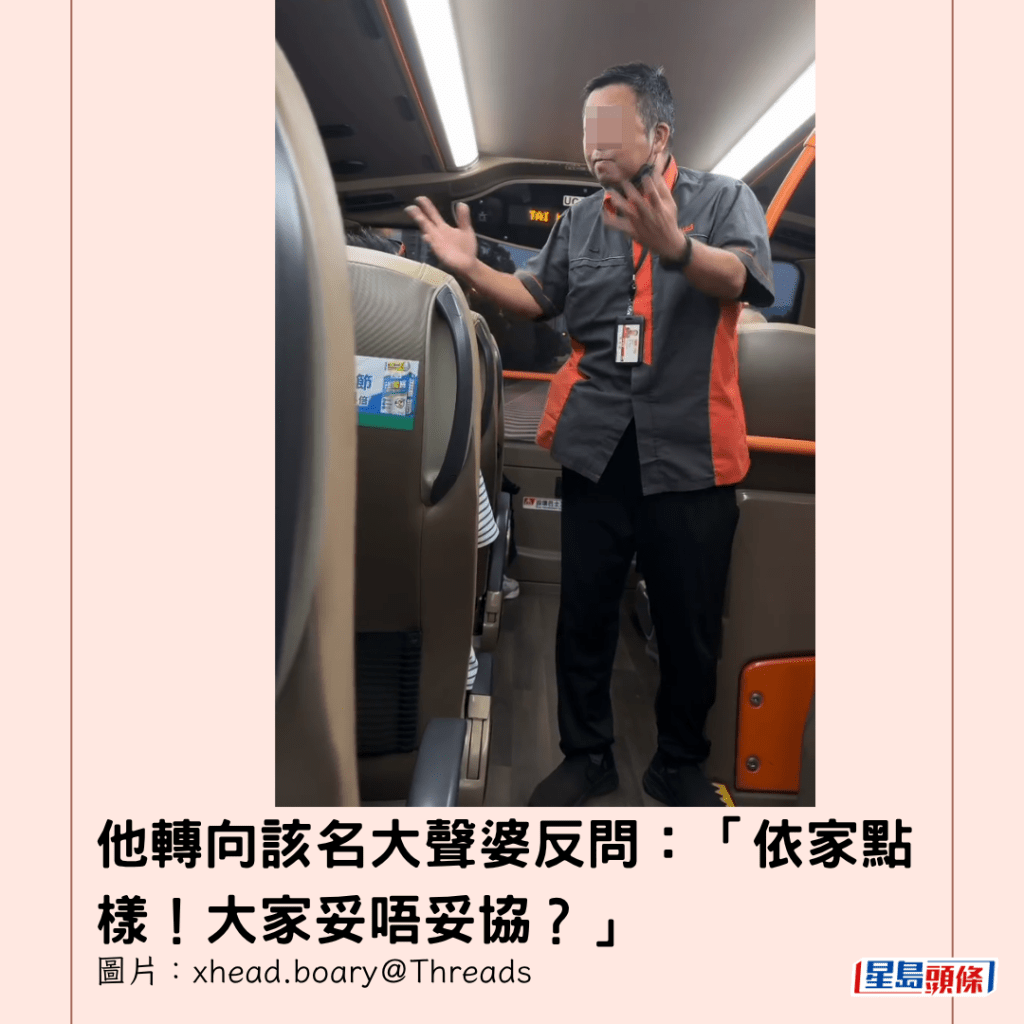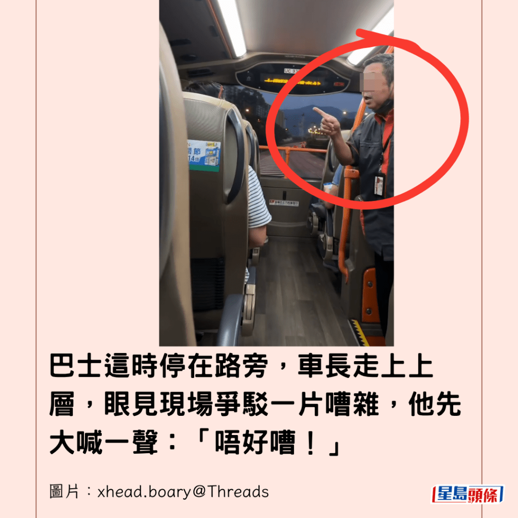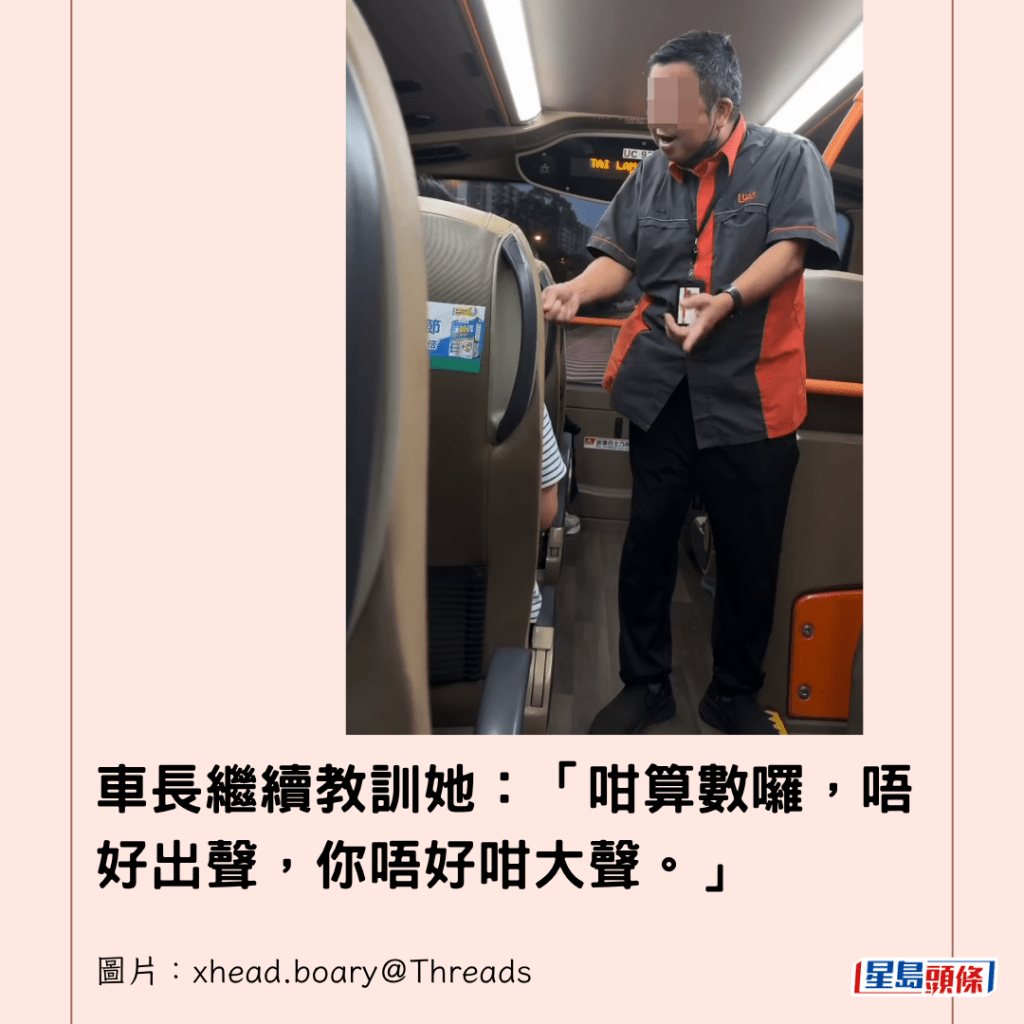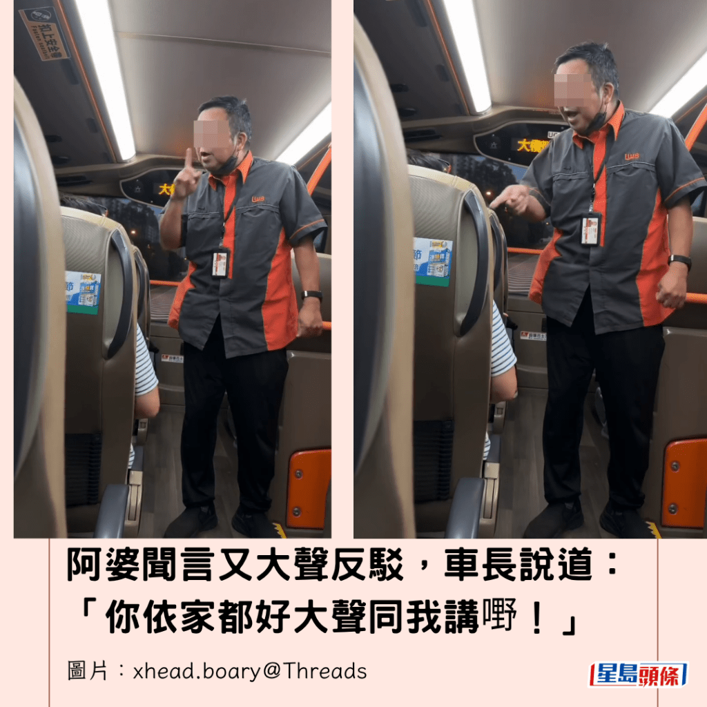 車長只好由樓梯,走上上層指著阿婆:「好大聲呀!」他隨即向全車乘客警告:「如果你哋再嘈,我一報警,你哋全部無得返去,去旅行無得去,去港珠澳全部無!」他說話時配上大動作加強語氣。