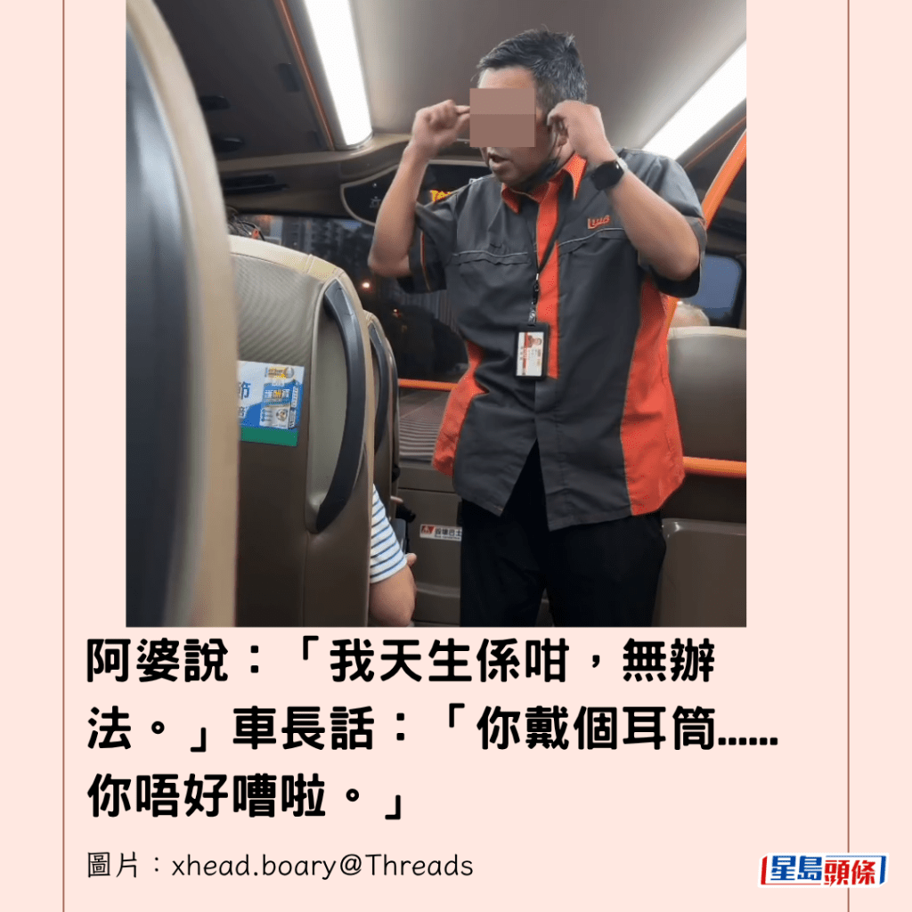 阿婆聞言又大聲反駁,車長說道:「你依家都好大聲同我講嘢!」阿婆說:「我天生係咁,無辦法。」車長話:「你戴個耳筒……你唔好嘈啦。」