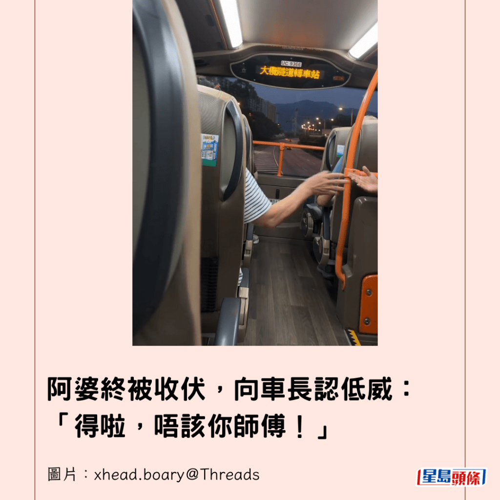 車長這時再向上層乘客呼嘯:「安靜,完咗,一人小句聲,唔好騷擾我揸車啦,平平安安,快快樂樂,去旅行去旅行,返屋企既返屋企!」阿婆終被收伏,向車長認低威:「得啦,唔該你師傅!」