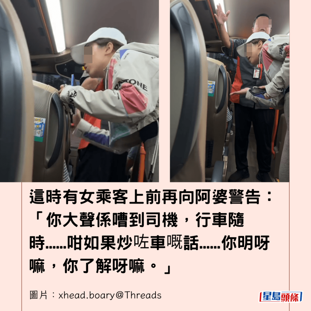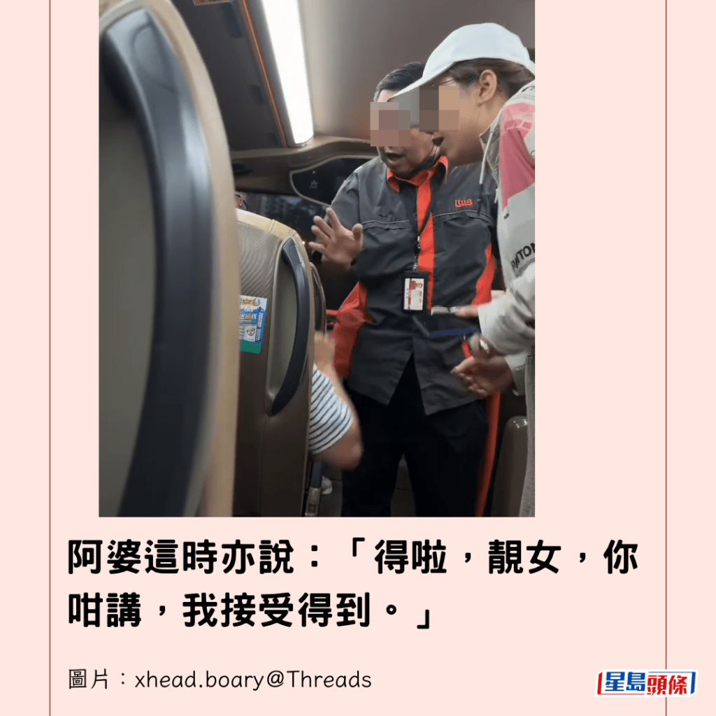 這時有女乘客上前再向阿婆警告:「你大聲係嘈到司機,行車隨時……咁如果炒咗車嘅話……你明呀嘛,你了解呀嘛。」阿婆這時亦說:「得啦,靚女,你咁講,我接受得到。」