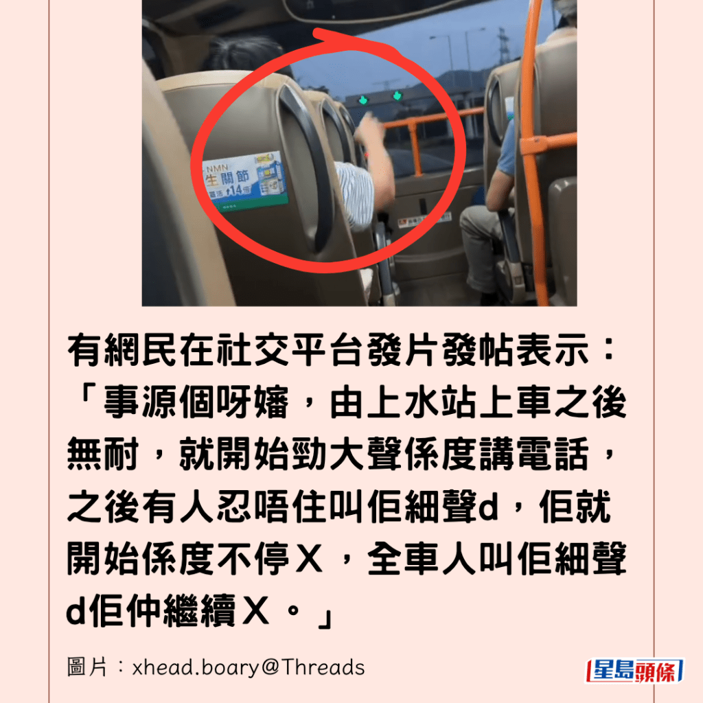 有網民在社交平台發片發帖表示:「事源個呀嬸,由上水站上車之後無耐,就開始勁大聲係度講電話,之後有人忍唔住叫佢細聲d,佢就開始係度不停X,全車人叫佢細聲d佢仲繼續X。」