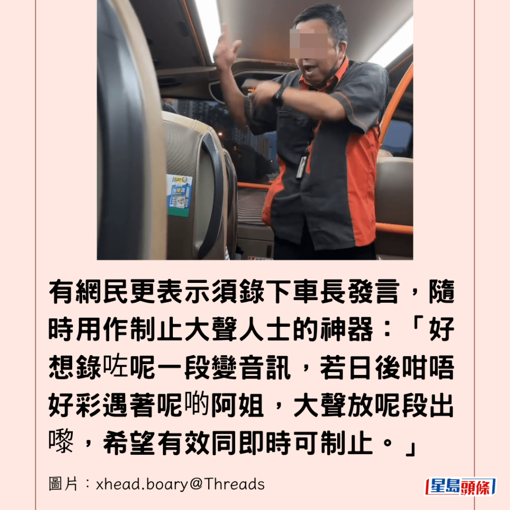 有網民更表示須錄下車長發言,隨時用作制止大聲人士的神器:「好想錄咗呢一段變音訊,若日後咁唔好彩遇著呢啲阿姐,大聲放呢段出嚟,希望有效同即時可制止。」