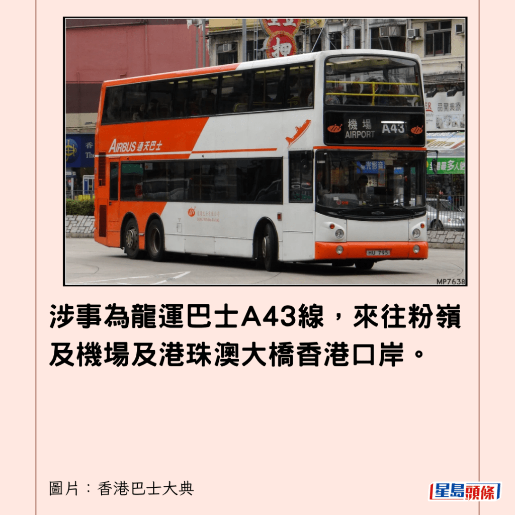 涉事為龍運巴士A43線,來往粉嶺及機場及港珠澳大橋香港口岸。