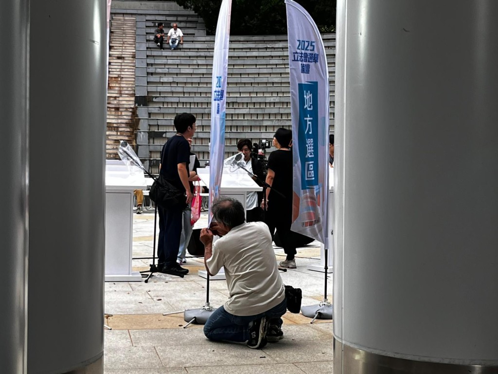 有工作人員在香港公園奧林匹克廣場佈置場地,當中有地區直選字眼的旗幟。李健威攝