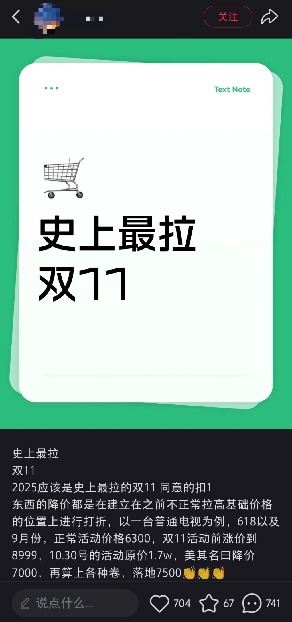 有博主稱自己今年購買一台普通電視,618購物節以及9月份,正常活動價格為6300元(人民幣,下同),但在雙十一活動前漲價至8999元,10月30日活動原價1.7萬元,用券後7500元可購得。