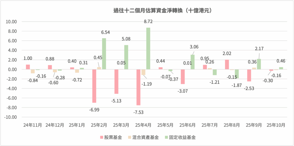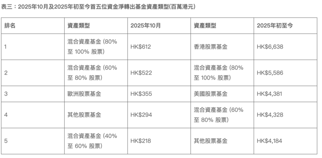 10月份資金淨轉出最多的前五個資產類別依序為「混合資產基金(80% 至 100% 股票)」、「混合資產基金(60%至80%股票)」、「歐洲股票基金」、「其他股票基金」和「混合資產基金(40%至60%股票)」。以上的混合資產基金主要投資於中港地區,今個月續錄得相對較大的淨流出,合共流出約13.5億。