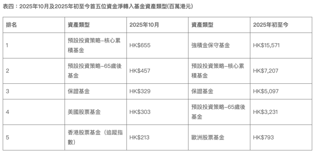 同月,資金淨轉入最多的前五個資產類別依序為「預設投資策略-核心累積基金」、「預設投資策略-65歲後基金」、「保證基金」、「美國股票基金」和「香港股票基金(追蹤指數)」。