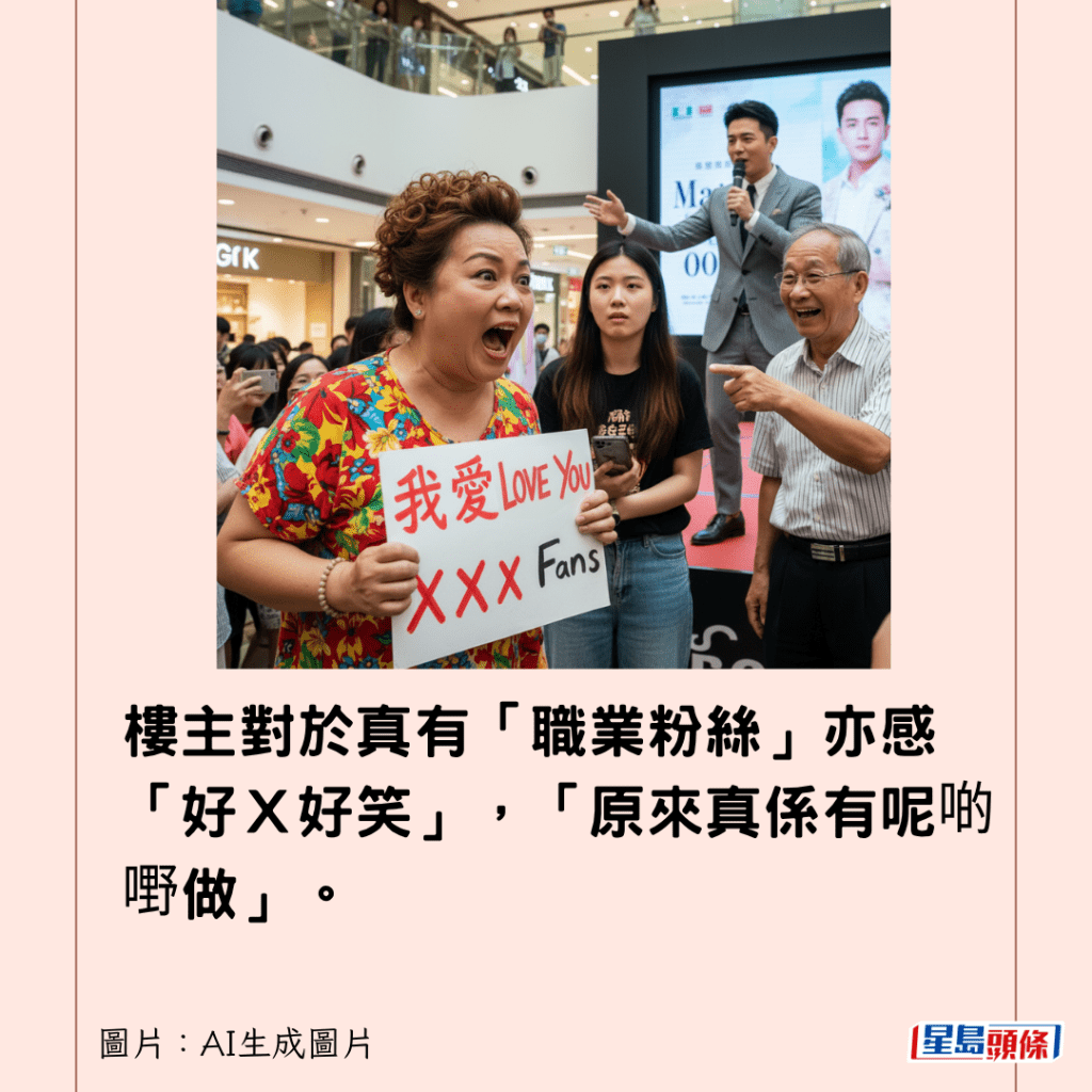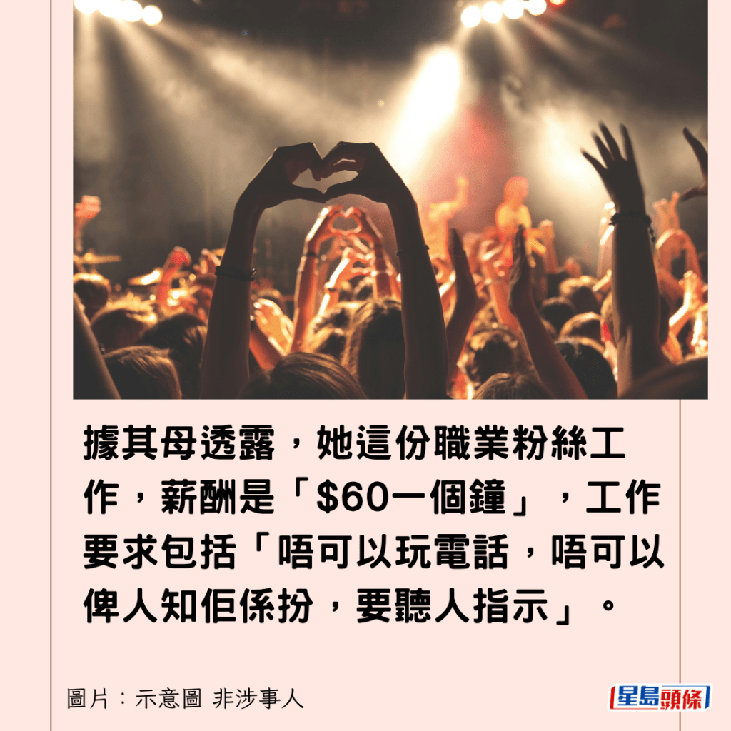 樓主對於真有「職業粉絲」亦感「好X好笑」,「原來真係有呢啲嘢做」。據其母透露,她這份職業粉絲工作,薪酬是「$60一個鐘」,工作要求包括「唔可以玩電話,唔可以俾人知佢係扮,要聽人指示」。