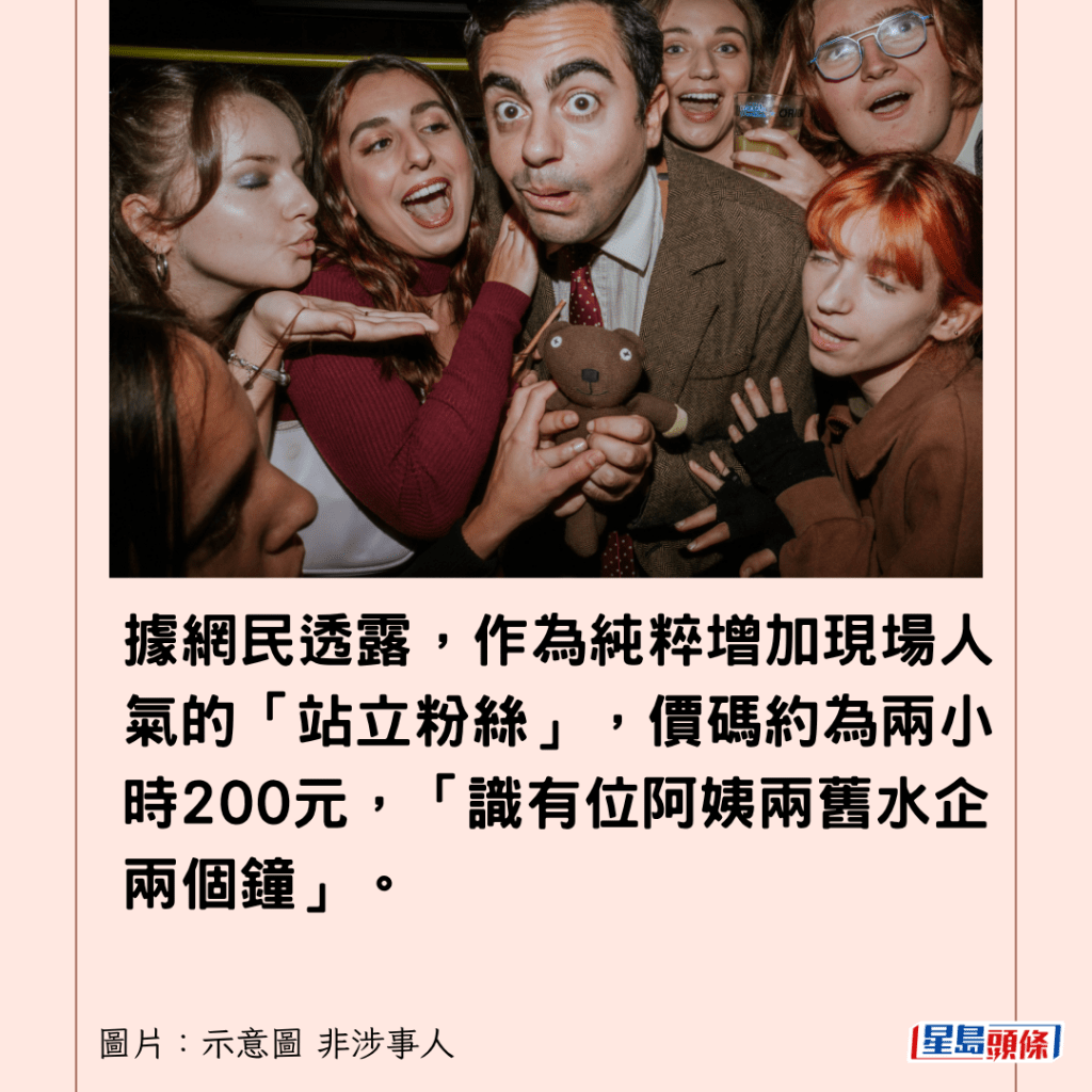 據網民透露,作為純粹增加現場人氣的「站立粉絲」,價碼約為兩小時200元,「識有位阿姨兩舊水企兩個鐘」。回溯到多年前,更有「50元一次」的懷舊價,適用於短時間的活動。