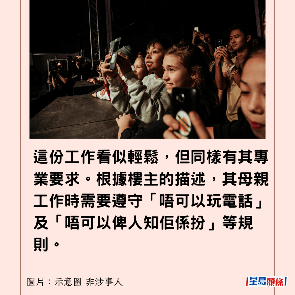 這份工作看似輕鬆,但同樣有其專業要求。根據樓主的描述,其母親工作時需要遵守「唔可以玩電話」及「唔可以俾人知佢係扮」等規則。