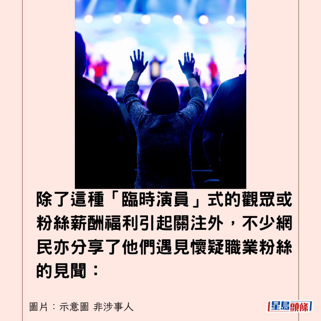 除了這種「臨時演員」式的觀眾或粉絲薪酬福利引起關注外,不少網民亦分享了他們遇見懷疑職業粉絲的見聞: