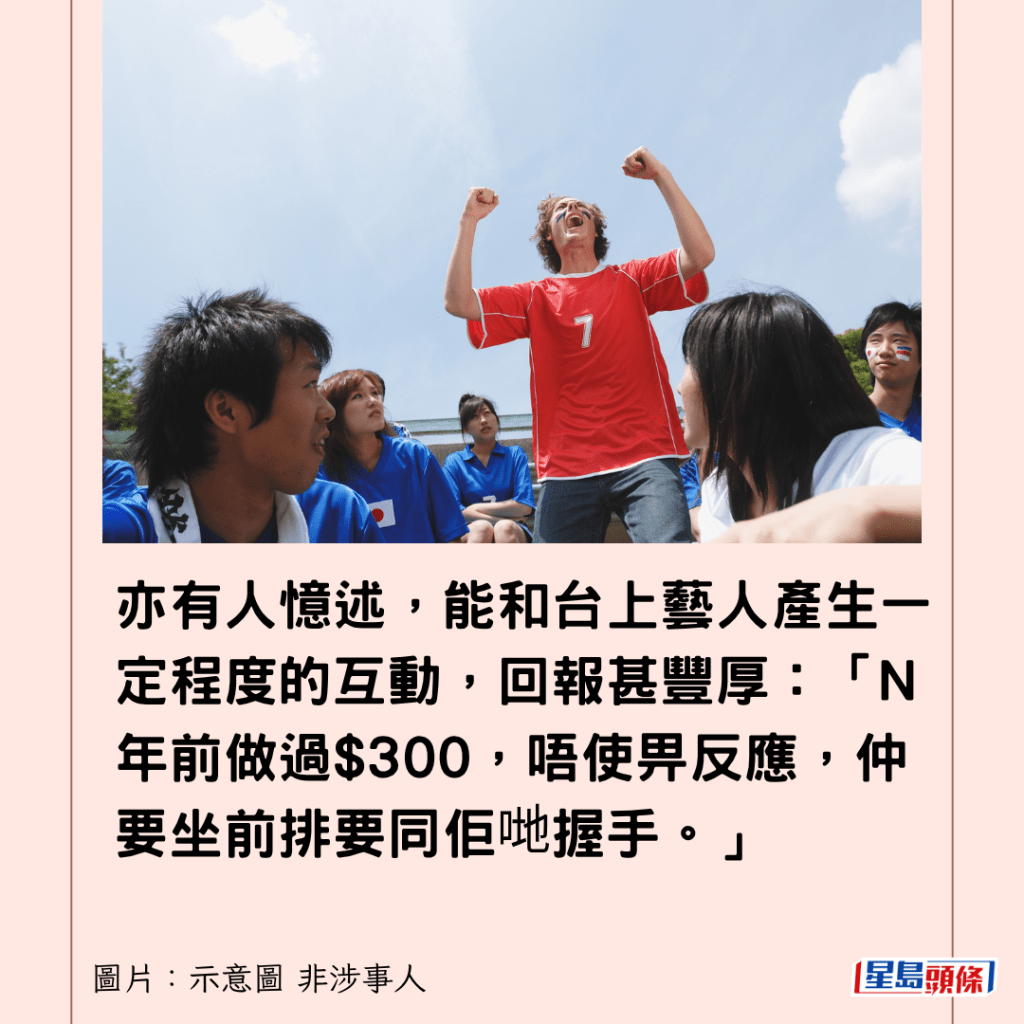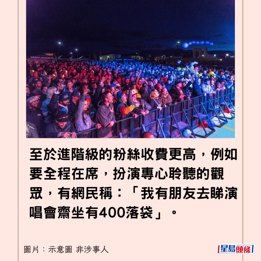 至於進階級的粉絲收費更高,例如要全程在席,扮演專心聆聽的觀眾,有網民稱:「我有朋友去睇演唱會齋坐有400落袋」。亦有人憶述,能和台上藝人產生一定程度的互動,回報甚豐厚:「N年前做過$300,唔使畀反應,仲要坐前排要同佢哋握手。」