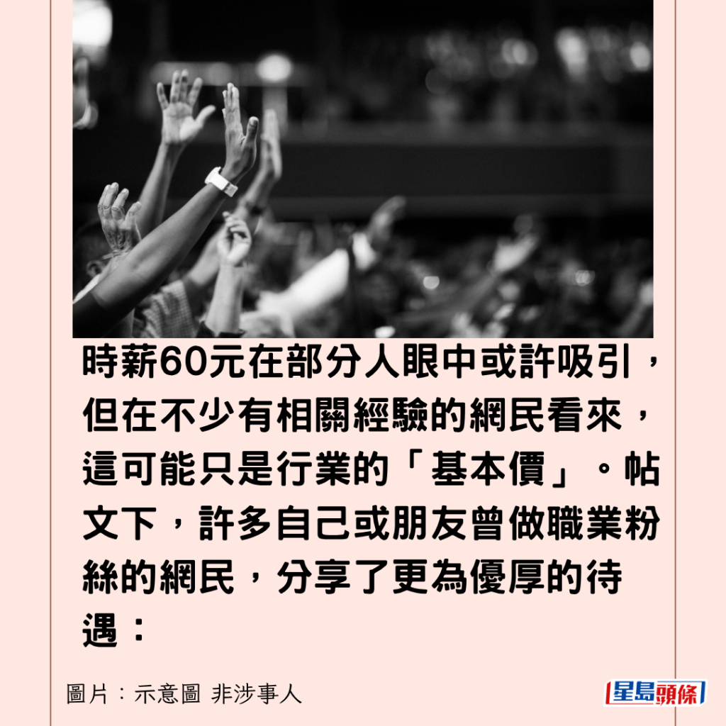 時薪60元在部分人眼中或許吸引,但在不少有相關經驗的網民看來,這可能只是行業的「基本價」。帖文下,許多自己或朋友曾做職業粉絲的網民,分享了更為優厚的待遇: