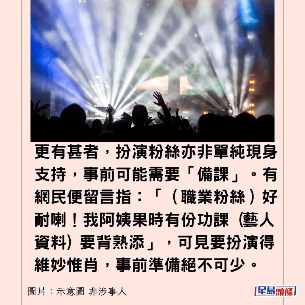 更有甚者,扮演粉絲亦非單純現身支持,事前可能需要「備課」。有網民便留言指:「(職業粉絲)好耐喇!我阿姨果時有份功課 (藝人資料) 要背熟添」,可見要扮演得維妙惟肖,事前準備絕不可少。