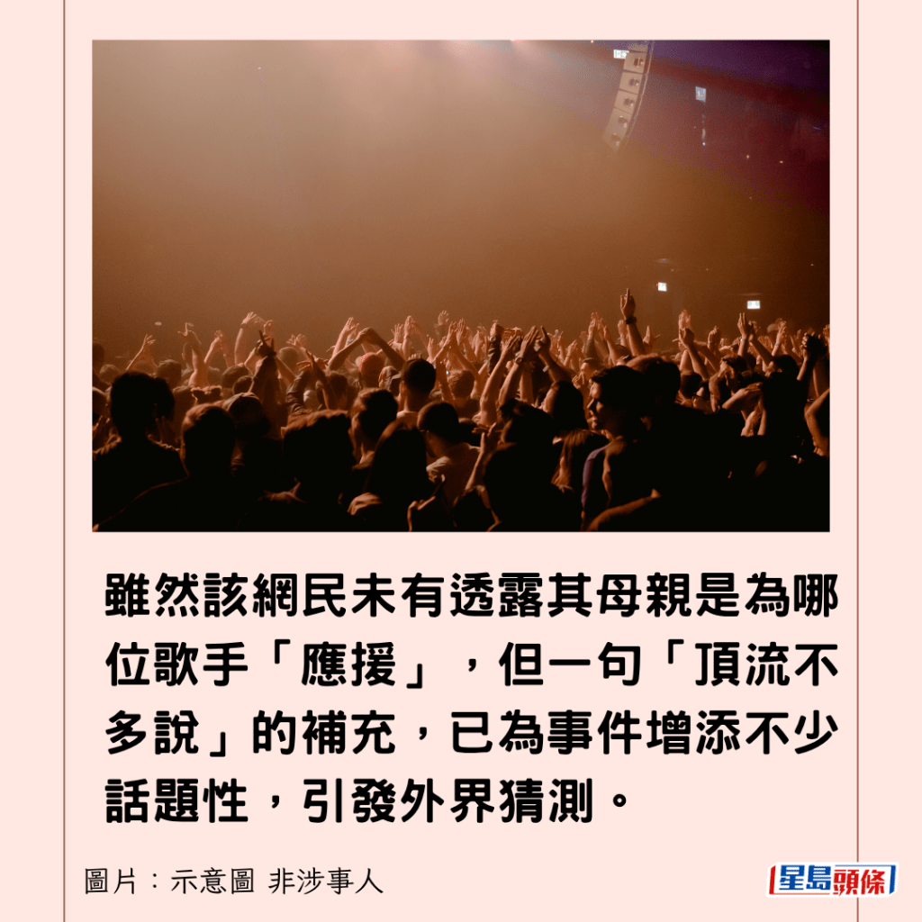 雖然該網民未有透露其母親是為哪位歌手「應援」,但一句「頂流不多說」的補充,已為事件增添不少話題性,引發外界猜測。這份特殊的工作性質,讓許多人首次了解到「職業粉絲」的存在,紛紛留言表示「想join」、「求介紹」,希望獲得入行機會。