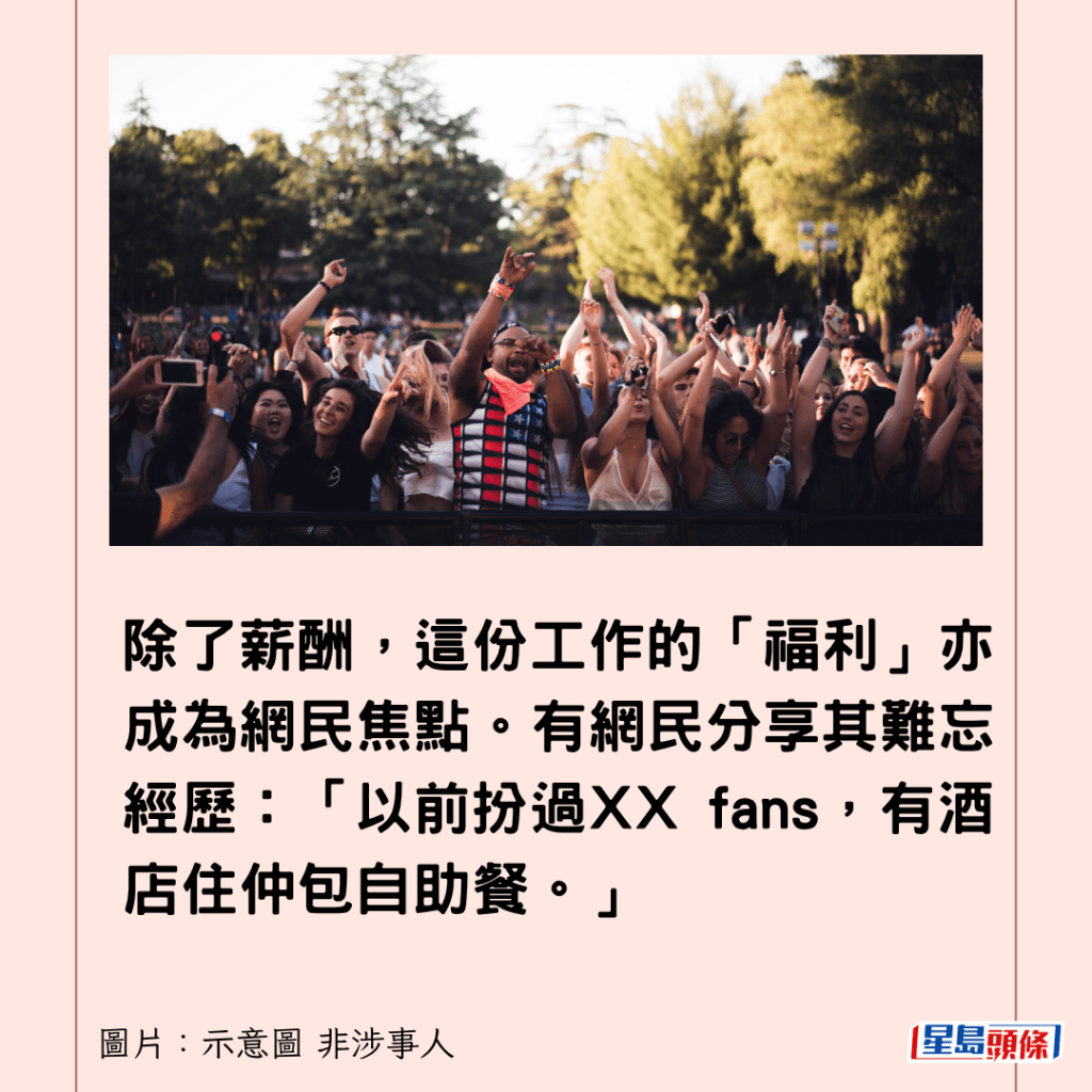 除了薪酬,這份工作的「福利」亦成為網民焦點,除了基本有飯盒派外,有網民分享其難忘經歷:「以前扮過XX fans,有酒店住仲包自助餐。」