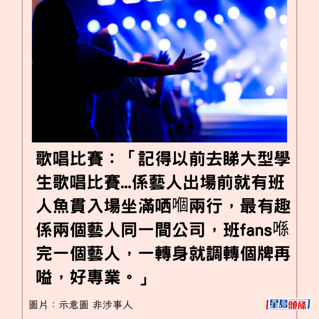 歌唱比賽:「記得以前去睇大型學生歌唱比賽…係藝人出場前就有班人魚貫入場坐滿哂嗰兩行,最有趣係兩個藝人同一間公司,班fans喺完一個藝人,一轉身就調轉個牌再嗌,好專業。」