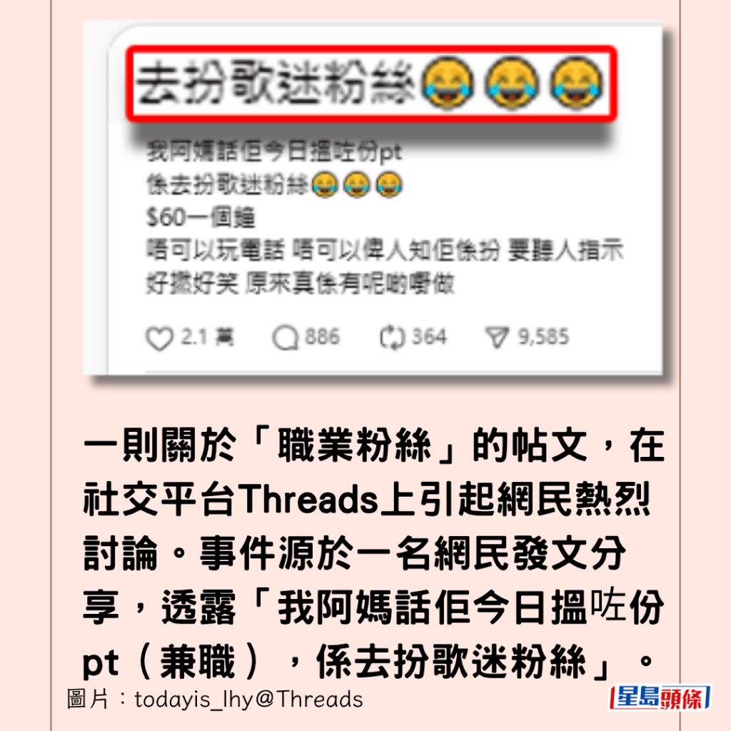 一則關於「職業粉絲」的帖文,近日在社交平台Threads上引起網民熱烈討論。事件源於一名網民發文分享,透露「我阿媽話佢今日搵咗份pt(兼職),係去扮歌迷粉絲」。