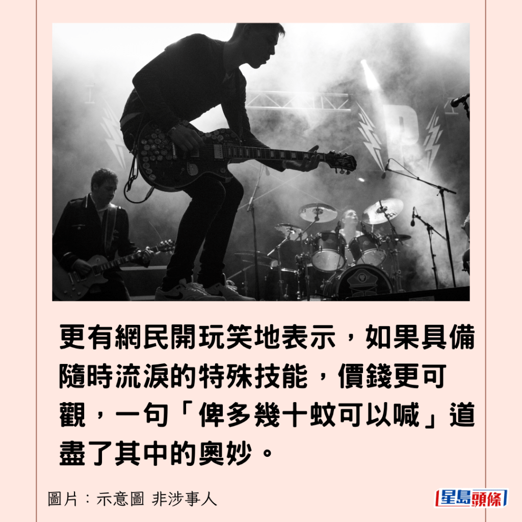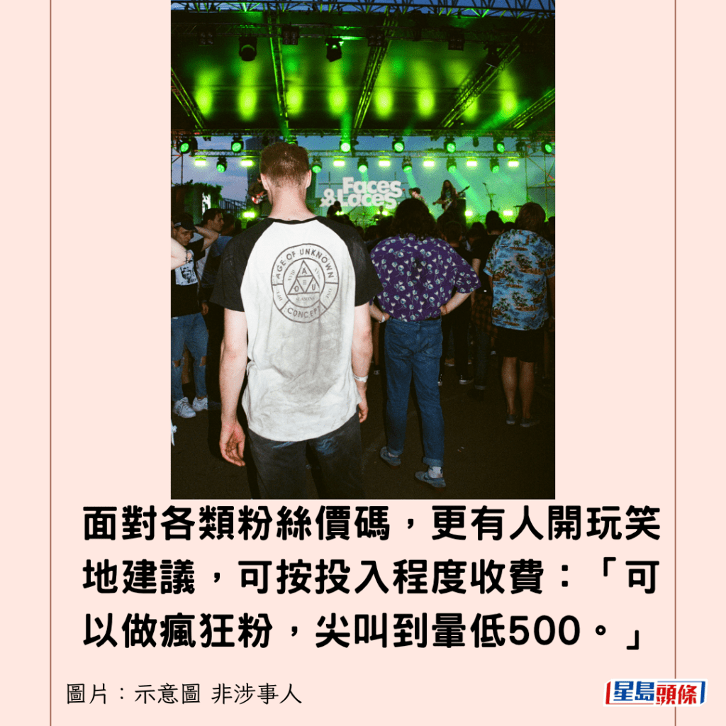 面對各類粉絲價碼,更有人開玩笑地建議,可按投入程度收費:「可以做瘋狂粉,尖叫到暈低500。」更有網民開玩笑地表示,如果具備隨時流淚的特殊技能,價錢更可觀,一句「俾多幾十蚊可以喊」道盡了其中的奧妙。
