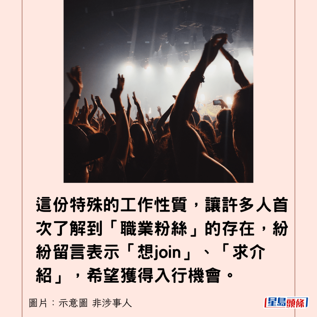 有網民在社交平台分享其母親找到一份特殊的兼職工作:受薪扮演歌手的粉絲。時薪60港元的待遇,加上工作的獨特性,令這則帖文迅速成為網上熱話,不少網民對此嘖嘖稱奇,更有人表示希望能夠應徵。