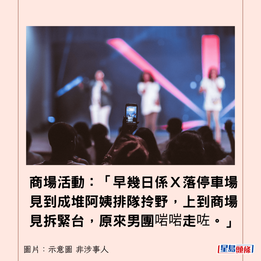 商場活動:「早幾日係X落停車場見到成堆阿姨排隊拎野,上到商場見拆緊台,原來男團啱啱走咗。」