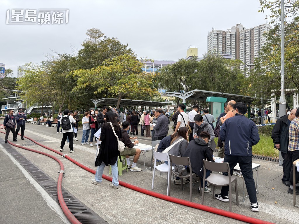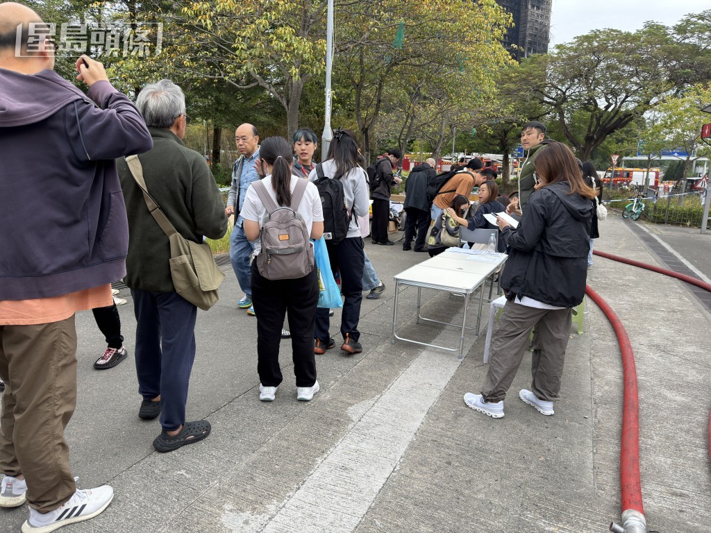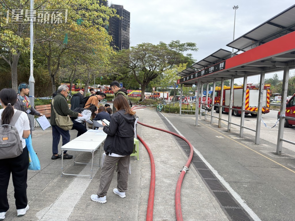 現場所見,公園的空地攞滿花束,燈柱和石壆亦貼有市民留下的字句,到來獻花的市民不絕。至於大火過後,不少商業機構及團體紛紛捐贈支援災民,其中九巴早前宣布透過「KMB Charity Foundation」捐出港幣200萬元,為宏福苑居民提供經濟援助,亦由今日起至下周二(12月2日)於大埔廣福邨巴士站設置登記處,向宏福邨居民每戶派發港幣1,000元應急錢。所見現場有大批居民排隊登記領取應急錢。