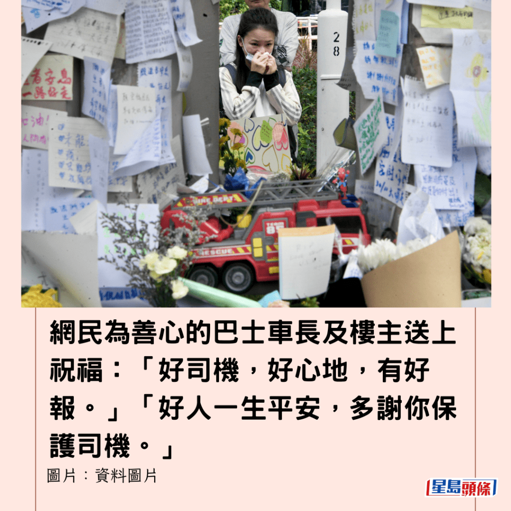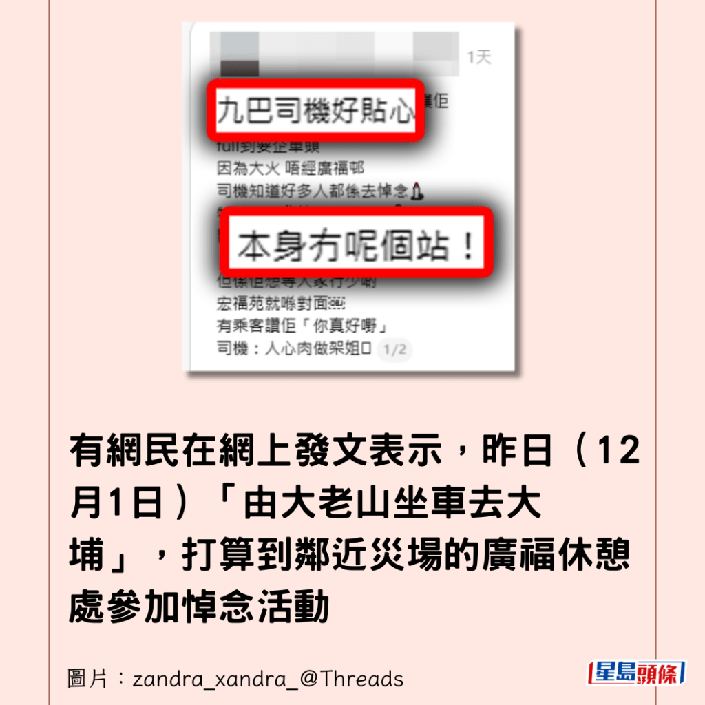 大埔宏福苑五級大火造成嚴重傷亡,大批市民連日前往毗近災場的廣福休憩處悼念死者,有網民分享,昨日(1日)因火災巴士改道,一位九巴暖心車長的「犯規」善舉,不但方便了悼念乘客,更觸動了無數人的心弦,引發全網默契守護這位「神級操作」的車長。