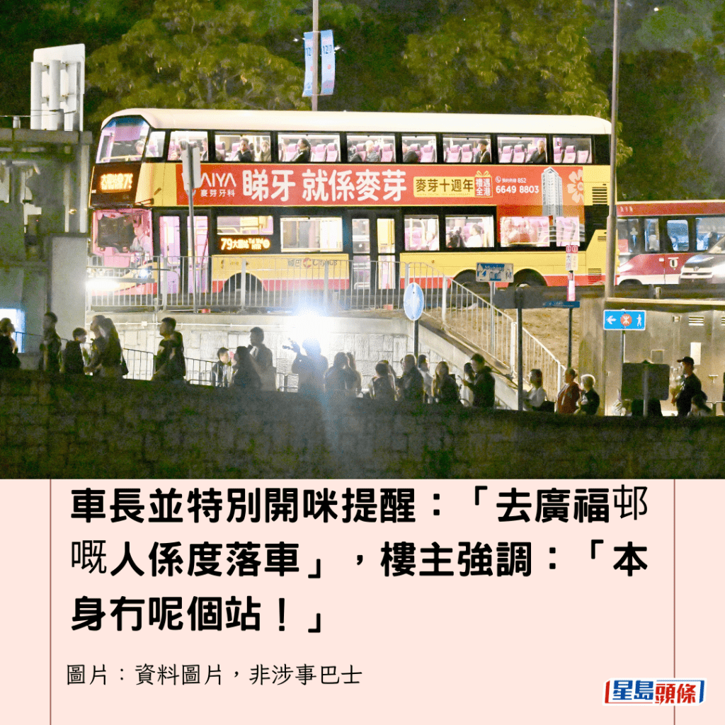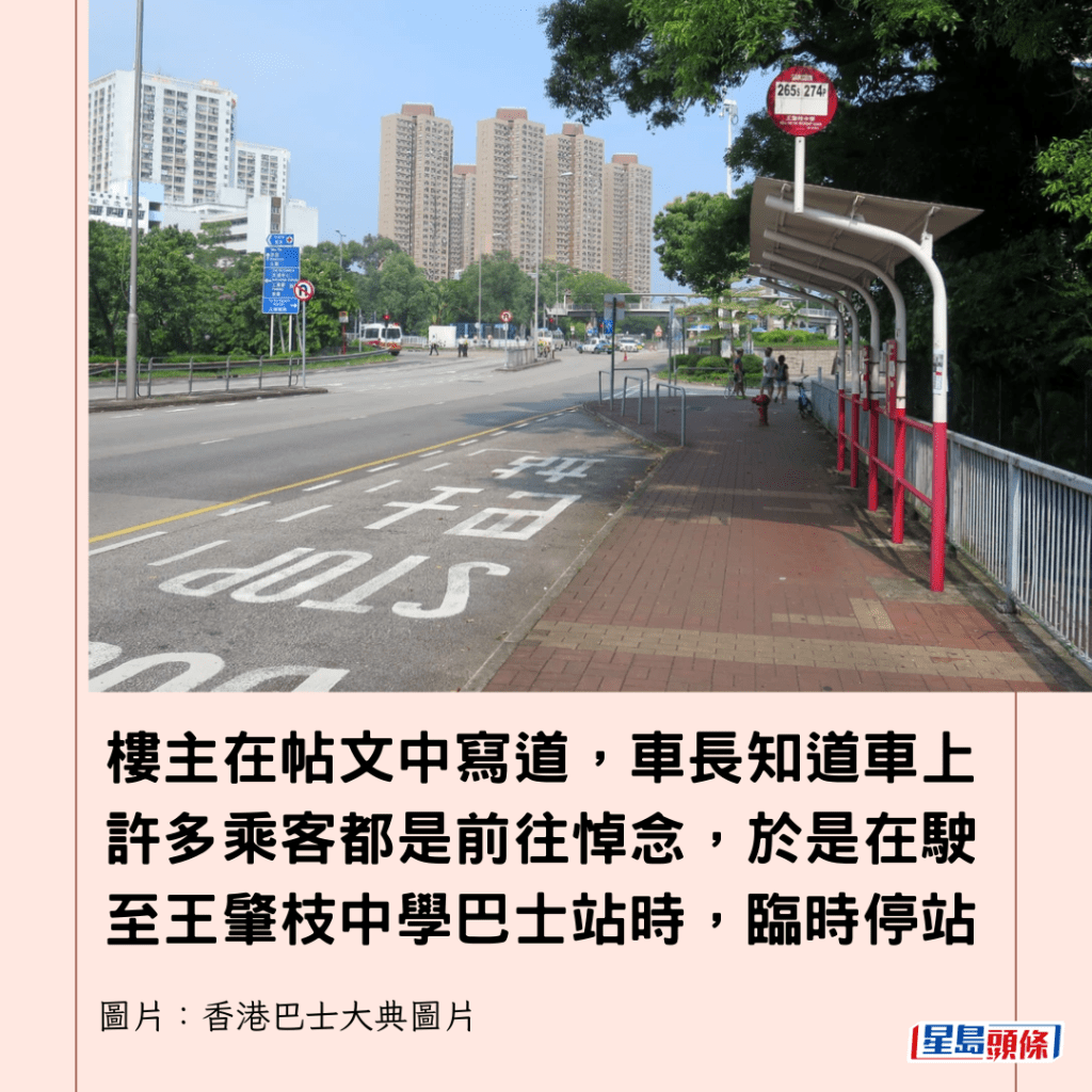 樓主在帖文中寫道,車長知道車上許多乘客都是前往悼念,於是在駛至王肇枝中學巴士站時,臨時停站,車長並特別開咪提醒:「去廣福邨嘅人係度落車」,樓主強調:「本身冇呢個站!」