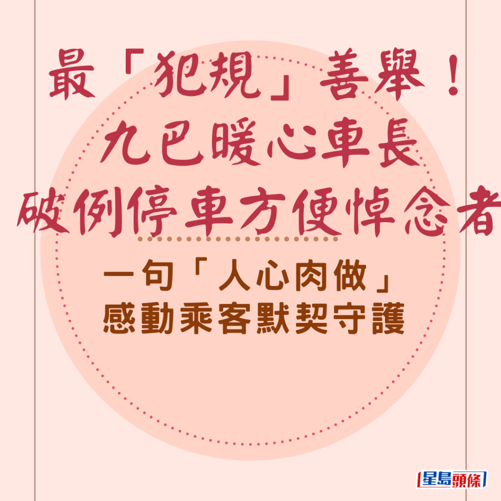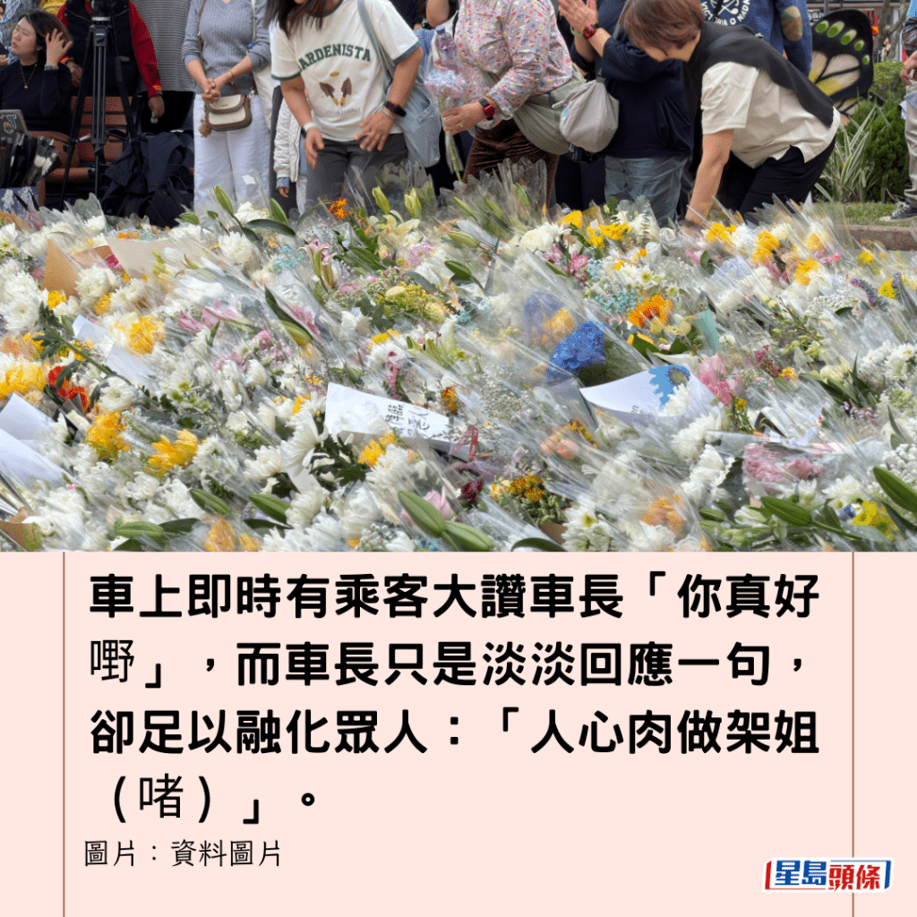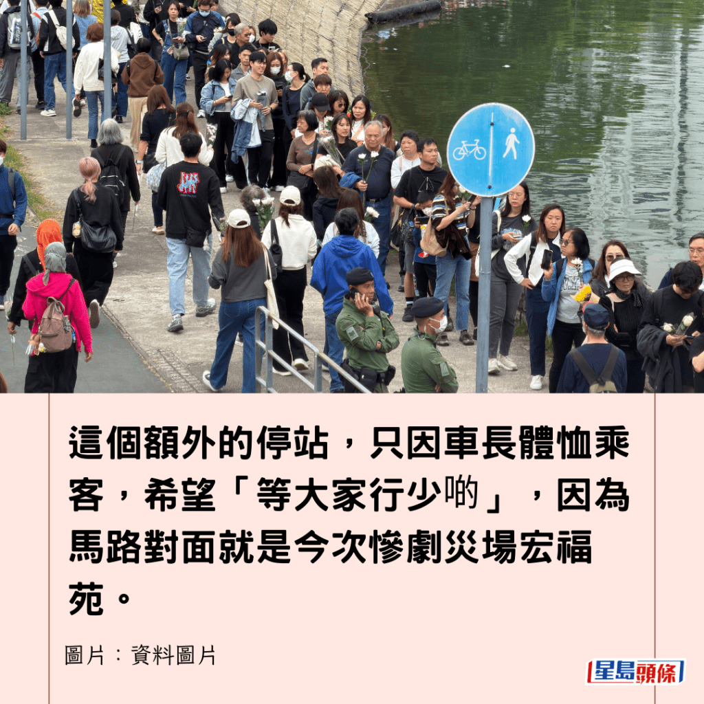 這個額外的停站,只因車長體恤乘客,希望「等大家行少啲」,因為馬路對面就是今次慘劇災場宏福苑。車上即時有乘客大讚車長「你真好嘢」,而車長只是淡淡回應一句,卻足以融化眾人:「人心肉做架姐(啫)」。