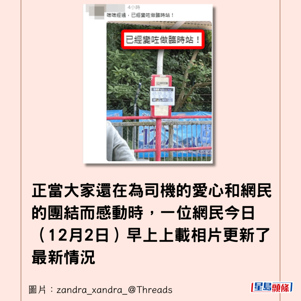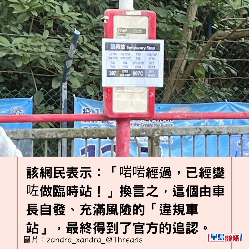 正當大家還在為司機的愛心和網民的團結而感動時,一位網民今日(2日)早上上載相片更新了最新情況,表示:「啱啱經過,已經變咗做臨時站!」換言之,這個由車長自發、充滿風險的「違規車站」,最終得到了官方的追認。