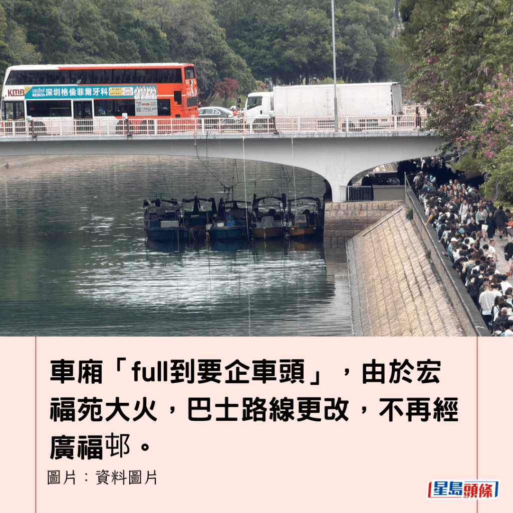 有網民在網上發文,表示昨日(1日)「由大老山坐車去大埔」,打算到鄰近災場的廣福休憩處參加悼念活動,車廂「full到要企車頭」。由於宏福苑大火,巴士路線更改,不再經廣福邨。