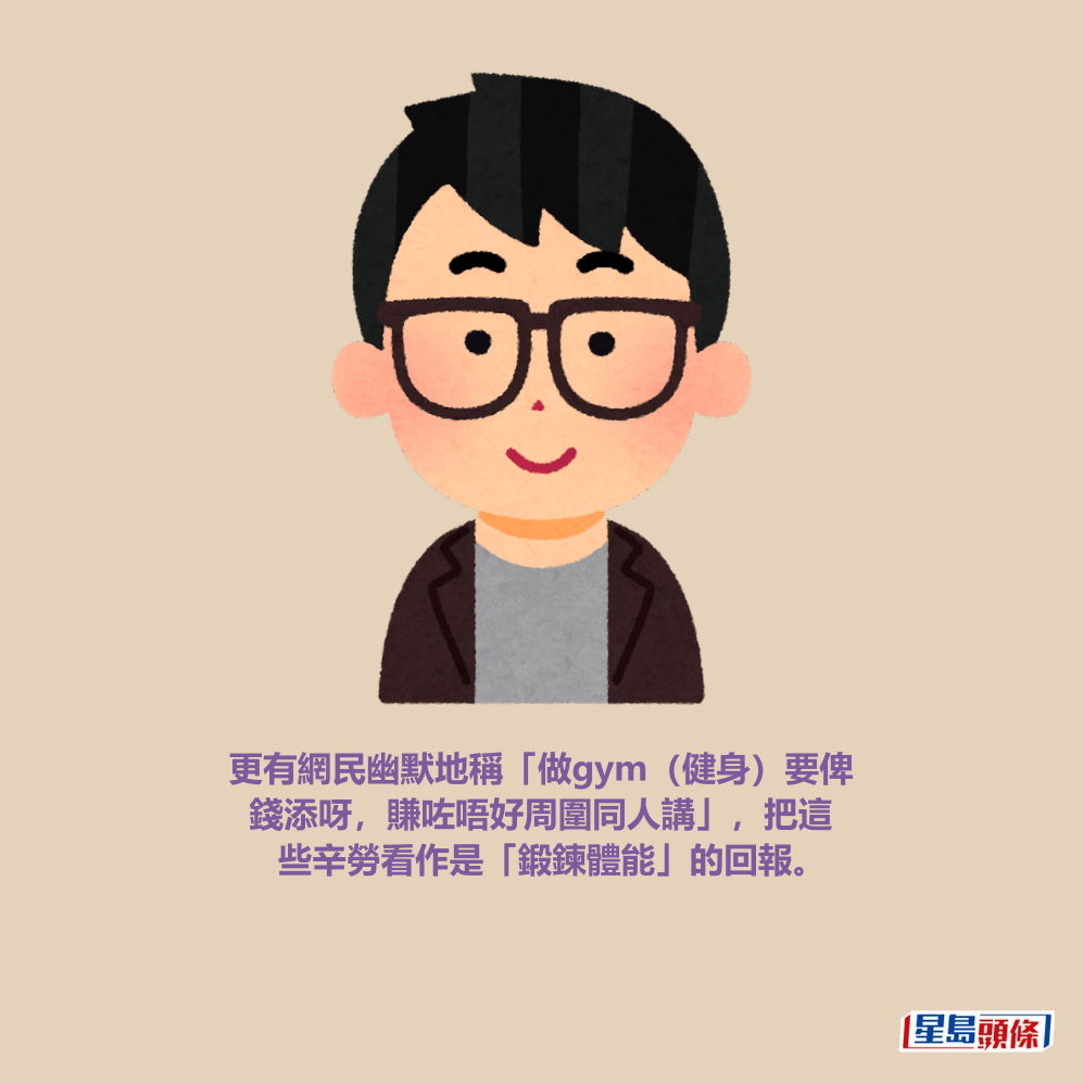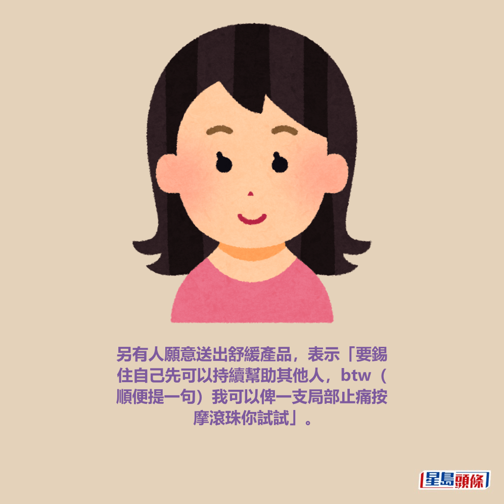 另有人願意送出舒緩產品,表示「要錫住自己先可以持續幫助其他人,btw(順便提一句)我可以俾一支局部止痛按摩滾珠你試試」。更有網民幽默地稱「做gym(健身)要俾錢添呀,賺咗唔好周圍同人講」,把這些辛勞看作是「鍛鍊體能」的回報。