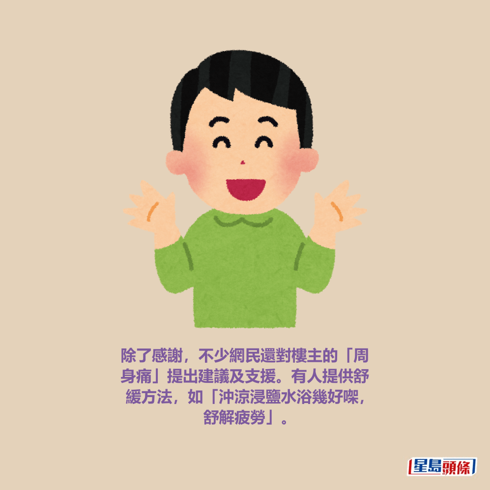除了感謝,不少網民還對樓主的「周身痛」提出建議及支援。有人提供舒緩方法,如「沖涼浸鹽水浴幾好㗎,舒解疲勞」;有網民笑言「恭喜你!你運動成功,所有痛嘅位置都用到力啦!好好沖個熱水涼舒緩下。多謝你幫手做義工。祝平安」。