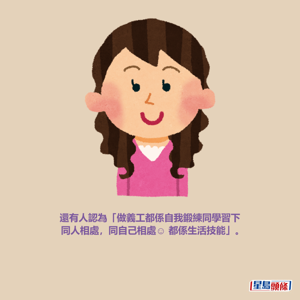 還有人認為「做義工都係自我鍛練同學習下同人相處,同自己相處☺️ 都係生活技能」。