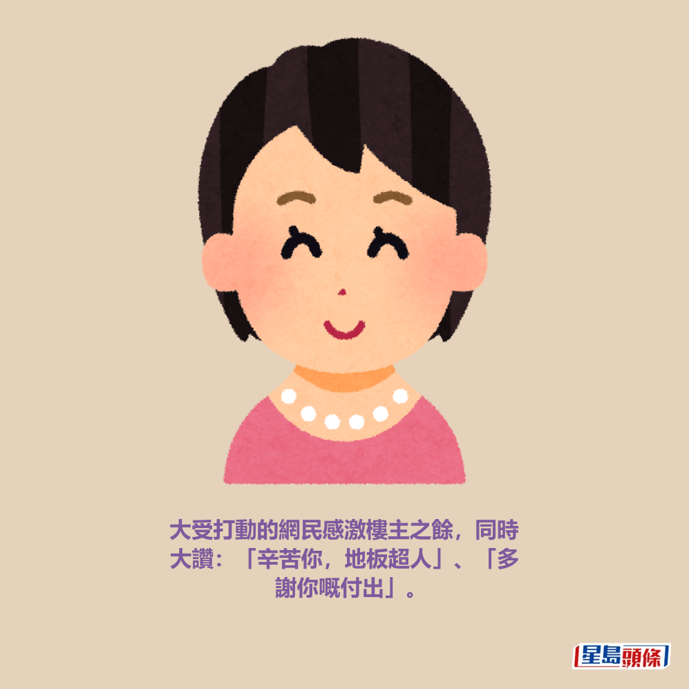 大受打動的網民感激樓主之餘,同時大讚:「辛苦你,地板超人」、「多謝你嘅付出」、「你們唔只係有體能,仲有善良的心。感激義工們多日的辛苦!」、 「辛苦晒,你哋真係好好,好彩有你哋喺度」、「辛苦晒,休息多啲,飲多啲水,食得健康啲」、「如果你無幫佢哋,而家痛緊嗰個就係佢哋」。