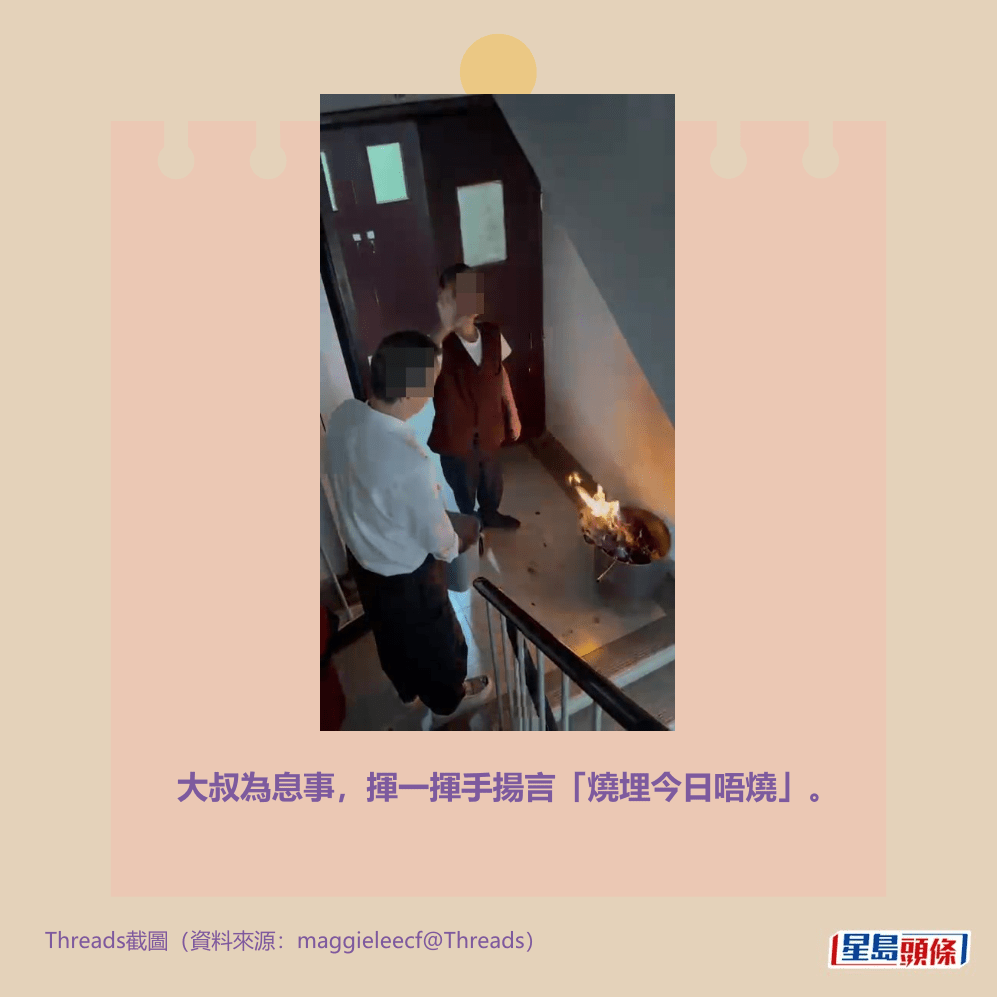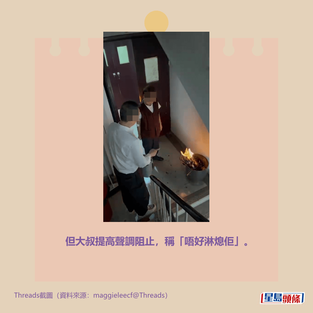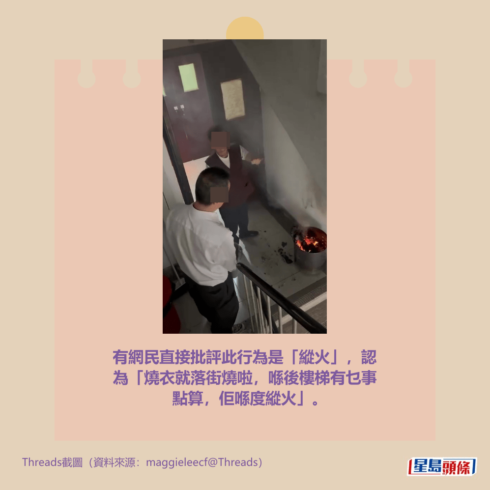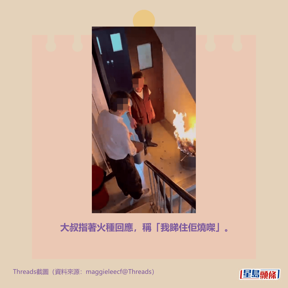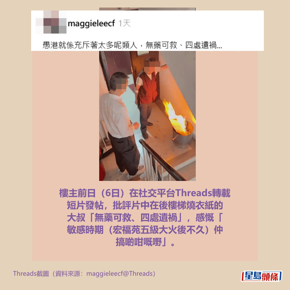 樓主前日(6日)在社交平台Threads轉載短片發帖,批評片中在後樓梯燒衣紙的大叔「無藥可救、四處遺禍」,感慨「敏感時期(宏福苑五級大火後不久)仲搞啲咁嘅嘢」。樓主及後在回應欄補充,「Sorry(對不起)唔記得講係群組轉發,我非當事人。嬲得滯唔記得補充返。🙏🏻🙏🏻